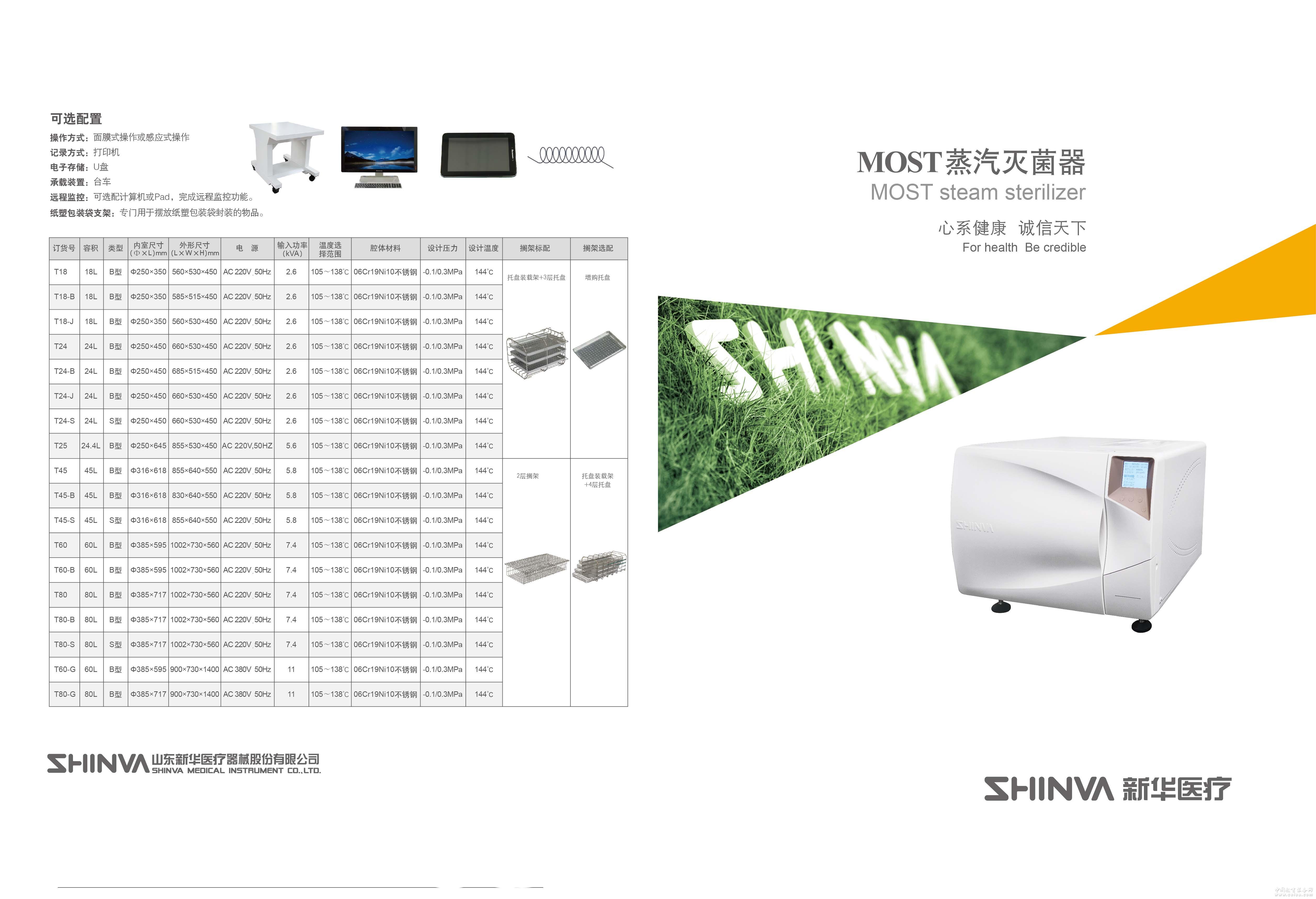 產品詳細介紹脈動真空滅菌器價格 脈動真空滅菌器價格低,新華醫療特約經銷商,價格優惠,質量保證! MOST-T系列臺式脈動真空滅菌器是以壓力蒸汽為介質的全自動高溫高壓快速滅菌設備。適用于口腔科、眼科、手術室、供應室、透析室、產房等醫療衛生部門,對所有包裝的或無包裝的:實心器械、A類空腔器械(牙科手機、內窺鏡)、植入性器械、敷料織物、橡膠導管等物品的滅菌。 新華醫療臺式脈動真空滅菌器性能特點: *內置敞開式水箱 采用內置敞開式水箱結構,便于水箱清洗,水箱一次注滿水后可多次運行程序,同時配置水質監測模塊,保證蒸汽質量的可靠性,同時保證設備的正常運行。 *全新的操作界面 采用全新的操作界面,液晶屏可顯示溫度、壓力、時間、運行狀態、故障報警等信息,使得滅菌信息更加直觀明了,便于用戶觀察設備的運行狀態。 *多重安全保護裝置 超溫自動保護裝置,蒸汽發生器的多重控制和保護,門安全聯鎖保護,雙重超壓保護,電子電路安全裝置。 自動門結構 MOST-T-18/24/45采用自動門結構,操作快捷方便,有效對人體進行可靠的保護,防止燙傷。滅菌器門結構采用多點同步連動壓合技術,使門密封更可靠,一鍵式開關門,快捷省力。 *高效的極限真空 采用高效的抽真空系統,工作噪音低,極限真空達到-90Kpa以上,抽空速度快,物品干燥效果好,滅菌更徹底。 *豐富的程序類型 設有裸露程序、包裝程序、橡膠程序、自定義程序、快速程序等滅菌程序和BD&Helix、真空測試程序以及預熱、干燥輔助類程序。 *高效的蒸汽發生器 MOST-T-18/24/45內置即時發生器,MOST-T-60/80內置儲能蒸汽發生器,蒸汽發生器產生蒸汽速度快,質量高。 *其他性能及特點 0.22μm除菌高效空氣過濾器,保證破除真空的空氣為無菌空氣,避免無菌物品再次污染。 注水、脈動真空、升溫、滅菌、排氣、真空干燥全過程自動運行。 覆膜式腔壁加熱膜,節能省時。 新華醫療臺式脈動真空滅菌器技術參數: 型號 MOST-T-18 MOST-T-24 MOST-T-45 MOST-T-60 MOST-T-80 設計壓力(Mpa) -0.1/0.3MPa 設計溫度(℃) 144℃ 溫度選擇范圍(℃) 105-138℃ 腔體材料 06Cr19Ni10不銹鋼 電源 220V 50/60Hz 功率(Kw) 2 2 3.8 7 7 容積(L) 18 24 45 60 80 內室尺寸(mm)(φ×L) φ250×350 φ250×450 φ316×618 φ385×595 φ385×717 外形尺寸(mm)(L×W×H) 585×515×450 685×515×450 830×640×550 1002×730×560 1002×730×560 設備重量(Kg) 55 65 115 160 180 王經理15908081101/qq3406227086 |