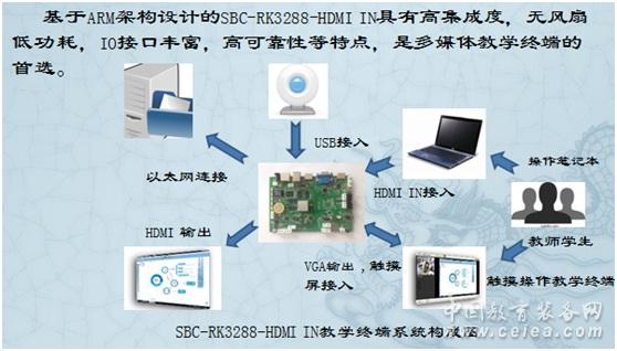 產品詳細介紹 深圳市聚蕓智能科技有限公司針對電子多媒體教學系統開發基于瑞芯微RK3288 CPU為基礎的支持HDMI IN攝像機及HDMI IN PC源輸入的多媒體教學終端-SBC-RK3288-HDMI IN主機。 SBC-RK3288-HDMI IN主機替代了傳統的商業計算機,提供PC的HDMI源信號接入,方便不同教師的筆記本電腦接入,同時也可以通過USB連接U盤或以太網連接服務器下載教學資料以便課堂使用;通過USB高清攝像頭接入主機,方便課堂教學視頻拍攝;另外,主機通過多種顯示輸出接口,分別連接講臺觸摸顯示器以及面對學生的教學電視,分別輸出不同畫面,達到操作界面和顯示界面同時運行,互不干擾。 隨著ARM 產品性能的大幅提升以及安卓操作系統應用軟件的極大豐富,采用SBC-RK3288-HDMI IN主機的多媒體教學終端得到廣泛的應用。具有穩定可靠的硬件系統,友好的人機界面,專業化的行業定制應用,高性價比的SBC-RK3288-HDMI IN主機是構建多媒體教學終端系統的不二之選。