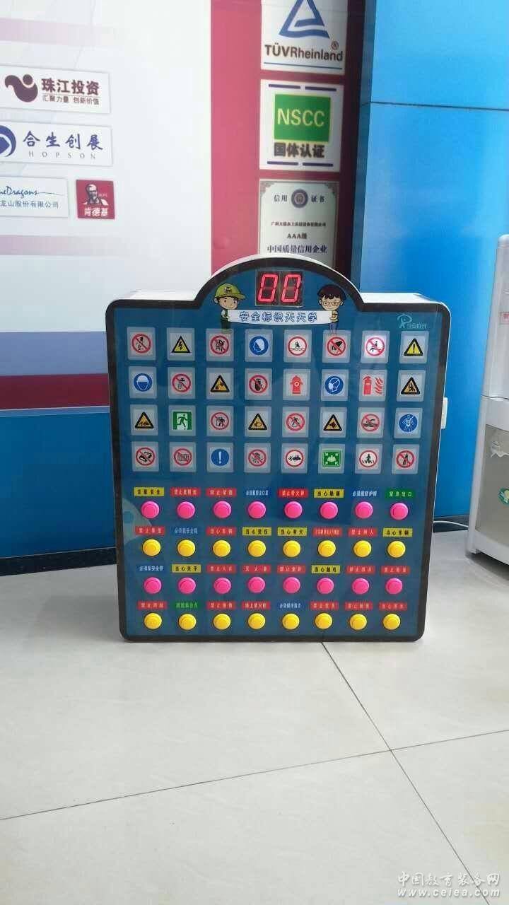4、功能簡介:a、自主學習(教學)模式,按開始鍵開始學習。按相應圖標確認后,開始下個圖標學習;中途無按鍵按下,一直等待, 圖標確認后,開始下個圖標學習,直到圖標學習結束。再按開始鍵下輪開. b、在學習模式之后,還可對教學效果進行評估,即測試模式。 二、操作說明: 1、功能說明: a、接上電源線后,打開電源開關后,機器自檢完后,教具待機狀態,按開始鍵,進入教學模式。 b、教學模式, 進入教學模式,相對應的圖標里面亮標,等待同學按鈕確認,同學找到相應圖標,并按下對應圖標下的按鈕,按鍵正確報語音:”學習正確”.按錯了報“加油”。如果沒有按下相應圖標一直等待,直到按下一個圖標鍵才學習;直到所有圖標學習完停止;再按開始鍵,繼續下個同學學習。每個同學開始教學顯示圖標不同。如甲同學開始顯示“禁止攀爬”。乙同學開始顯示:“求救電話”。直到所有圖標學習完。