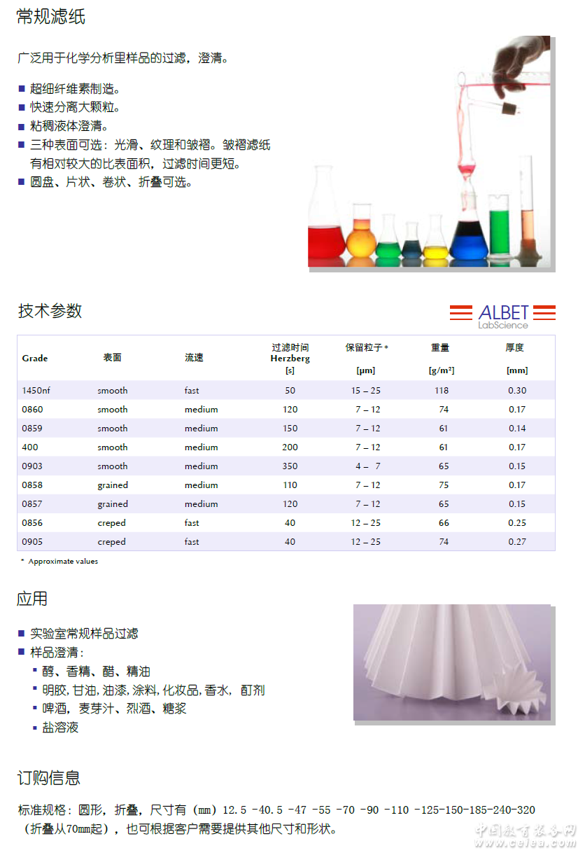 常規(guī)濾紙,廣泛用于化學分析里樣品的過濾,澄清。 超細纖維素制造。 快速分離大顆粒。 粘稠液體澄清。 三種表面可選:光滑、紋理和皺褶。皺褶濾紙 有相對較大的比表面積,過濾時間更短。 圓盤、片狀、卷狀、折疊可選。 |