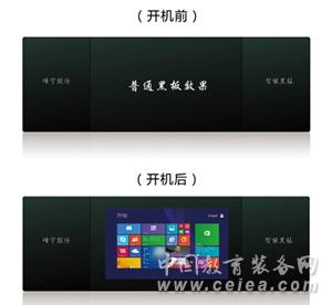 當打開電源時,中間一塊顯示出液晶的顯示畫面,可以進行觸摸互動,而關掉時,顯示畫面隱形,又顯示為一個普通黑板的表象,在上面進行書寫。