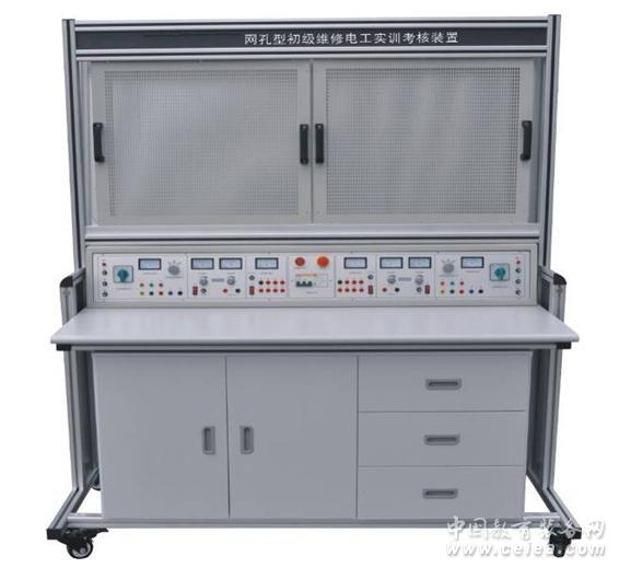 一、概述 網孔型初級維修電工實訓考核裝置主要由實訓桌、網孔板、實訓元器件(也可自購)組成。學生根據實訓線路進行元器件的合理布局,安裝、接線全部由學生自行完成,接近工業現場。能完成機床線路,電機控制線路,照明配電的模擬操作、安裝調試的綜合實訓,訓練學生動手能力和實操技能。實訓項目可自行確定,根據所選的項目選擇相應的元器件。該裝置也可作為電工考工的考核設備。