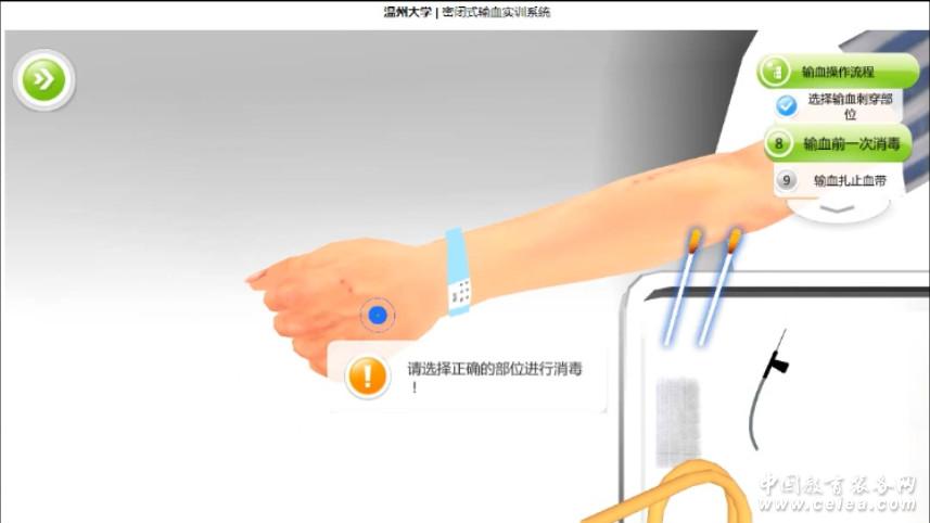 軟件模擬醫院輸血環節,設立仿真情景,按流程操作,分為受血者血樣采集,接收血液,輸血三大部分;