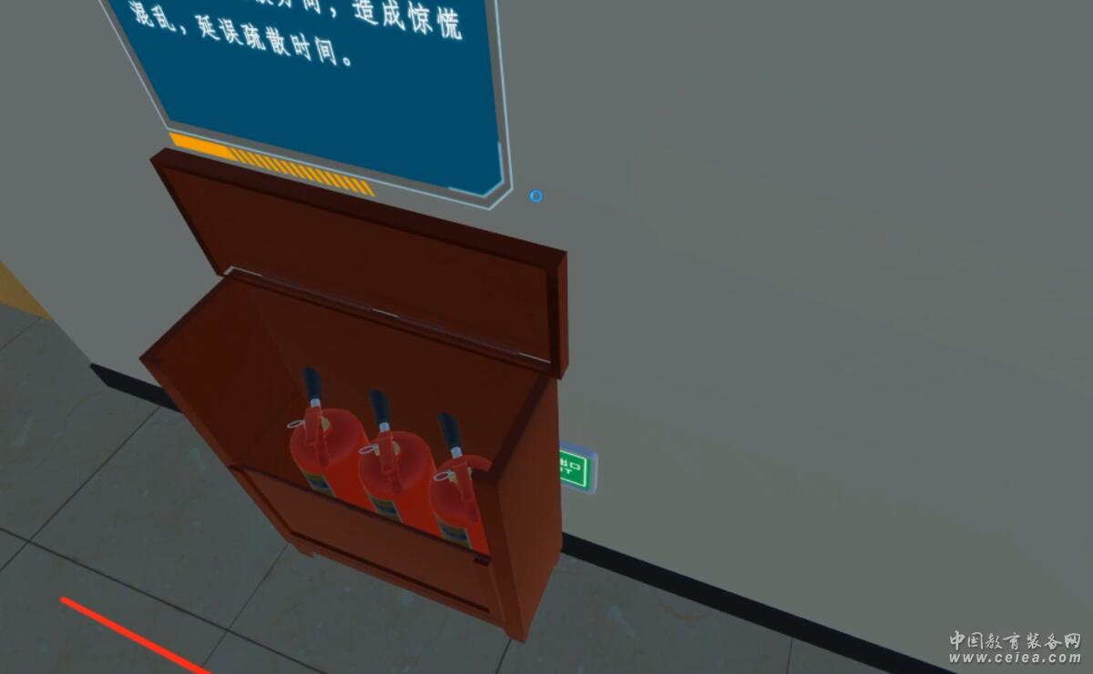 二﹑產(chǎn)品基本功能 用戶可以通過攜帶HTC VIVE 頭盔切換和移動視角,并可以跟虛擬場景進(jìn)行交互動作,逐一排查宿舍樓內(nèi)消防安全隱患點(diǎn),沉浸式學(xué)習(xí)消防安全內(nèi)容。 用戶還可以通過虛擬現(xiàn)實(shí)頭盔查看文字說明和感受語音提示。
