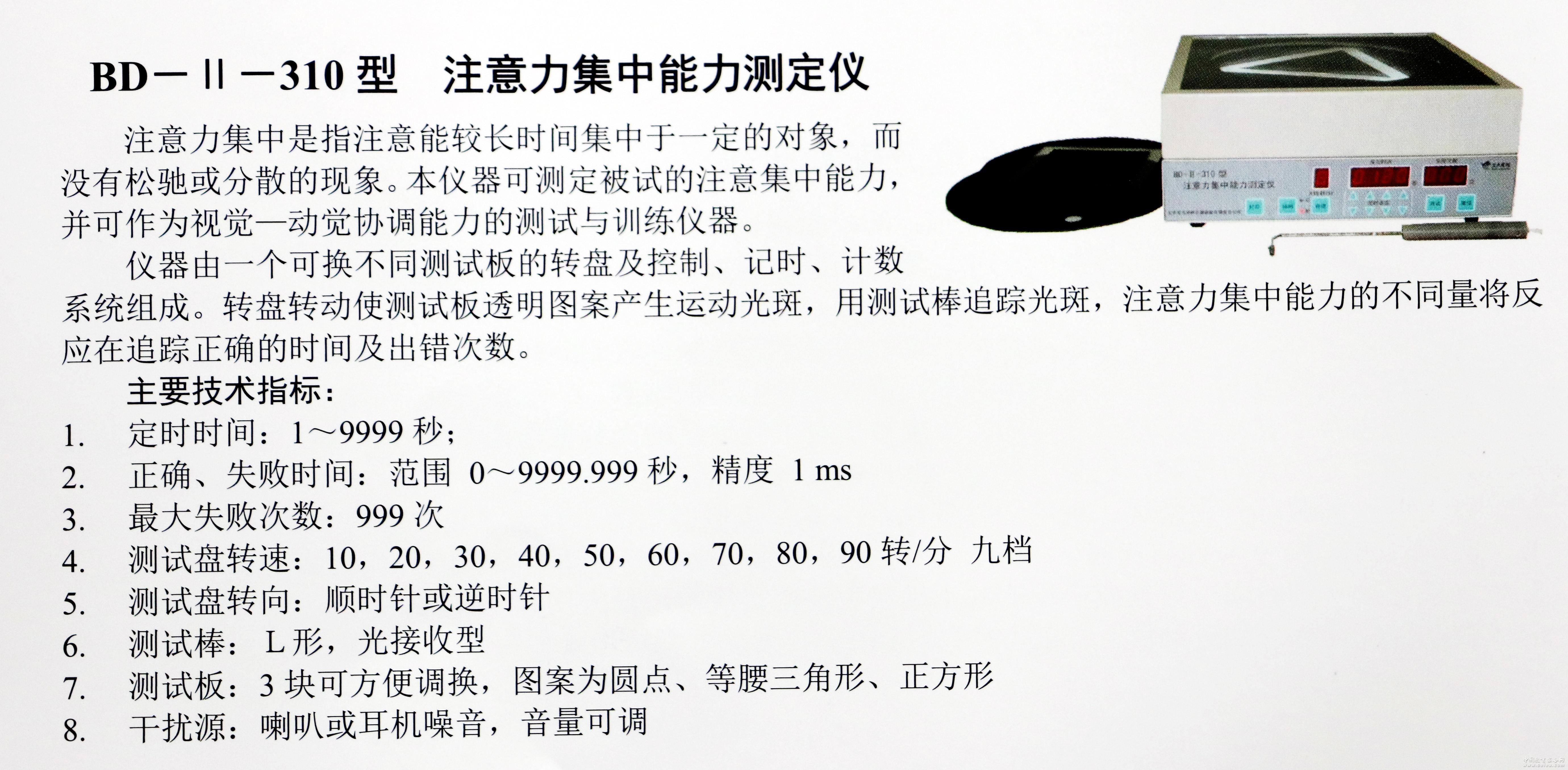 產品詳細介紹測定被試的注意集中能力,可作視覺—動覺協調能力的測試與訓練。⒈定時時間:1—9999秒;⒉正確、失敗時間范圍:0-9999.99秒,精度1ms;⒊測試盤轉速分九檔;⒋測試盤轉向為順時針或逆時針;⒌測試板圖案為圓點、等腰三角形、正方形。⒍箱內光源:環行日光燈,22w,⒎外型尺寸320×320×140mm。⒏微型打印機(選購),可打印實驗條件,正確、失敗時間及失敗次數。 |