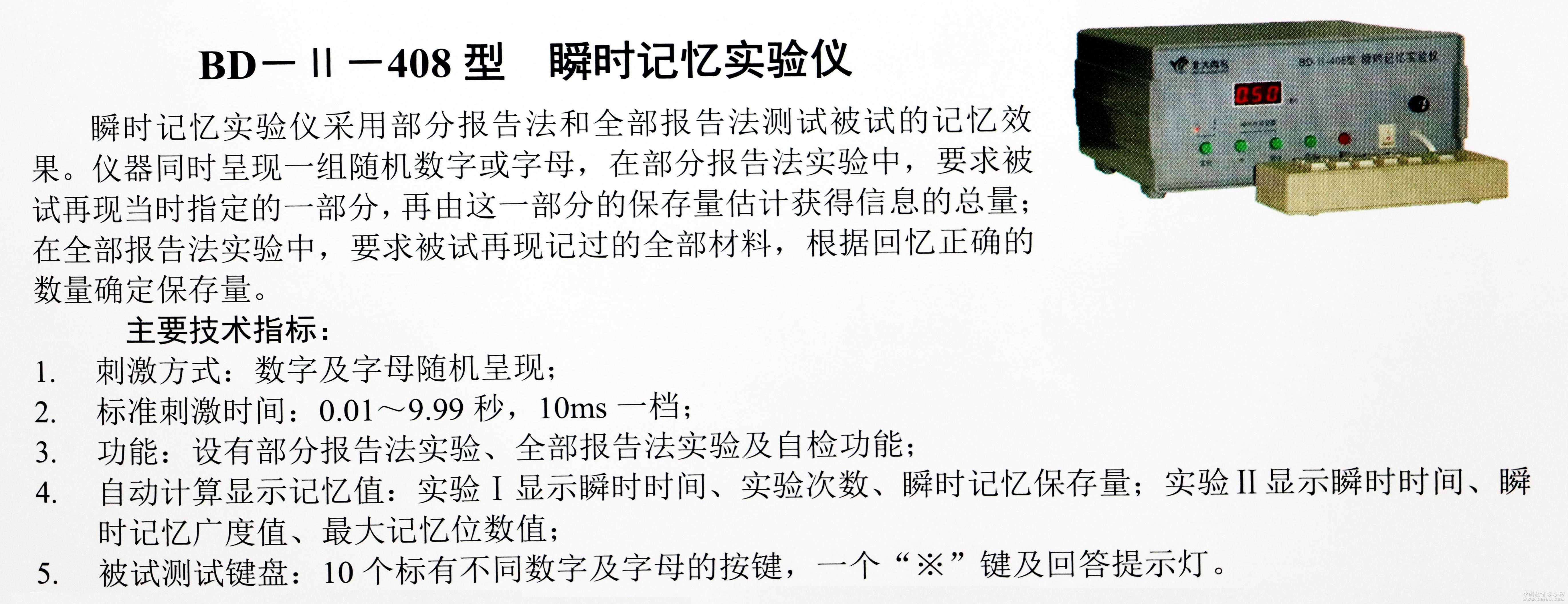 產品詳細介紹采用部分報告法和全部報告法測試被試的短時記憶效果。刺激方式:數字及字母隨機呈現;標準刺激時間:0.01—9.99秒,10ms一檔;功能:設有部分報告法實驗、全部報告法實驗及自檢功能;自動計算顯示記憶值。