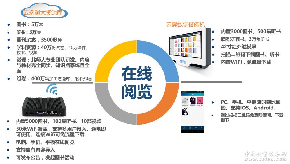 課中——課堂互動(dòng)教學(xué)系統(tǒng) 智慧課堂教學(xué)系統(tǒng)提供的課堂互動(dòng)教學(xué)系統(tǒng),是將信息化教學(xué)融入45分鐘的課堂教學(xué),兼?zhèn)渚W(wǎng)絡(luò)教與學(xué)、教學(xué)管理及溝通、通訊等全方位功能,打破傳統(tǒng)的單項(xiàng)教學(xué)模式,實(shí)現(xiàn)老師、學(xué)生、家長的互聯(lián)、互動(dòng)、互通及資源共享,提供在線備課、評(píng)測(cè)分析、文字聽寫、小組討論、文件分發(fā)、強(qiáng)化練習(xí)、資源共享等功能,打造研討式、體驗(yàn)式、混合式等創(chuàng)新教學(xué)環(huán)境。 課后——在線閱覽系統(tǒng) 智慧課堂教學(xué)系統(tǒng)提供的在線閱覽系統(tǒng),在云端超大資源庫和云屏數(shù)字借閱機(jī)的硬件與軟件相配合下為學(xué)生提供各種書籍、期刊、課件、試卷、視頻等等課外輔助學(xué)習(xí)內(nèi)容,方便學(xué)生在課后查缺補(bǔ)漏。5萬本書籍;3萬集聽書;3000種期刊;40萬份試卷、課件、教案;50萬分鐘視頻;名師微課,科學(xué)權(quán)威;動(dòng)漫課堂,寓教于樂;400萬精加工道題庫, 輕松組卷;配備賬號(hào),任一電腦均可使用讓學(xué)生充分利用課余時(shí)間提高學(xué)習(xí)成績(jī)