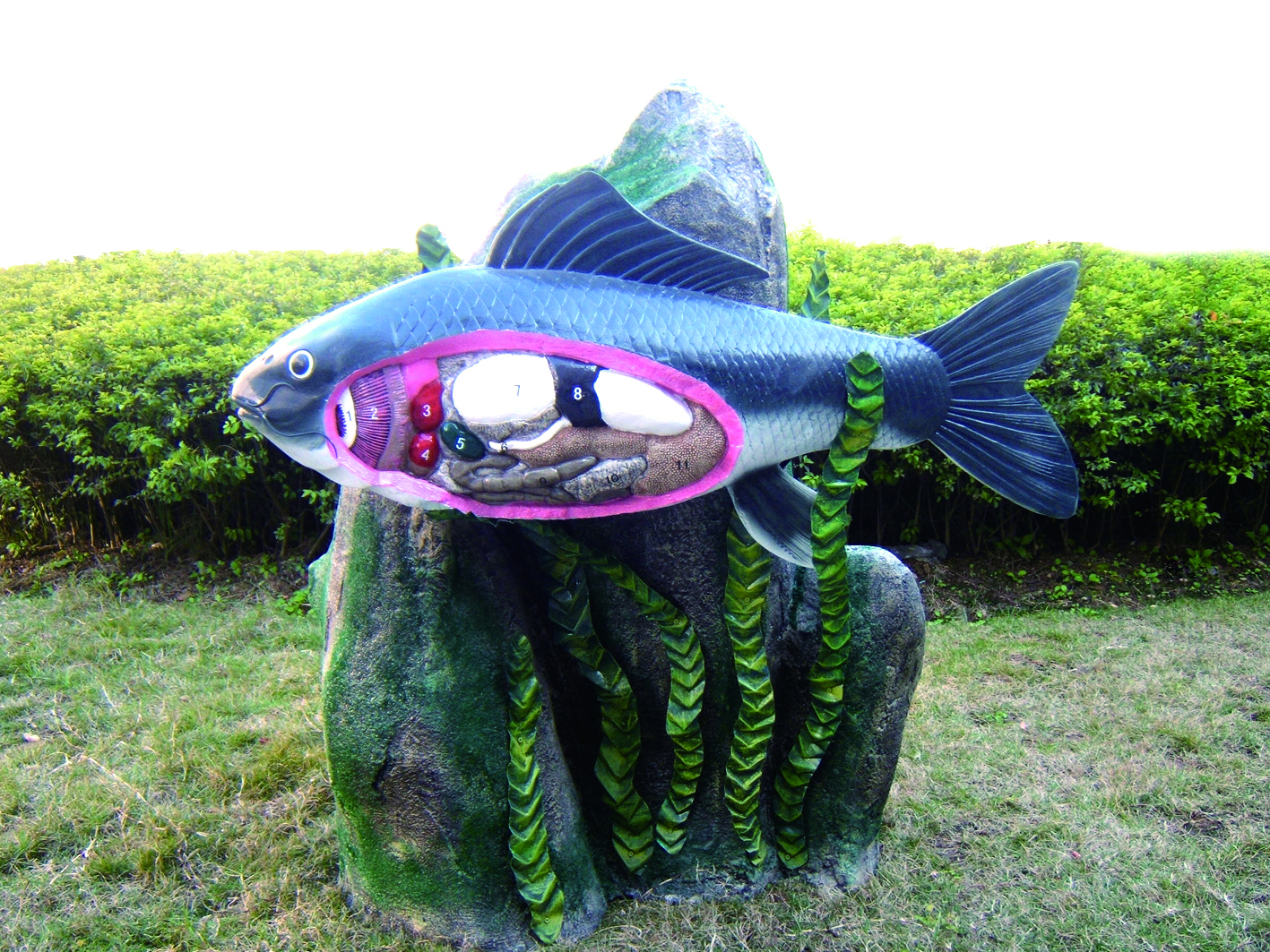 產品詳細介紹1200mm×350mm(高度不包括魚鰭)×210mm;高分子材料,以有色無機物為填充料,阻燃性好,采用多層網狀玻璃纖維布,一次性高壓成形,平均厚度5mm以上。表面使用進口烤漆,不易褪色。 教學元素:模型表現了鯉魚的解剖詳細情況,內容包括:1.鰓耙、2.鰓、3.心房、4.心室、5.膽囊、6.輸尿管、7.膘、8.腎、9.腸、10.胰臟、11.卵巢♀等。識別功能:根據實物等比制作,大小比例協調,內容詳細,真實性較強。鯉魚體色真實,鯉魚明亮逼真的眼睛,白色的胸腹,用銅條制作的魚須,魚鰭3個,魚鱗的大小及分布都按實際比例制作,解剖面積為560mm×260mm,解剖為高浮雕效果。 模型底座識別功能:底座采用仿真海底石頭,材料為高分子混合材料制成,以有色無機物為填充材料,具有良好的阻燃性,使用多層網狀玻璃纖維布一次性高壓成形,平均厚度5mm以上。仿真海底石頭由3塊石頭組合而成,中間一塊高1300mm,左邊一塊高830mm,右邊一塊高560mm,總寬1080mm,總厚390mm。顏色為仿真海底石頭顏色,并夾帶海底地衣效果。使用進口烤漆,不易褪色。 |