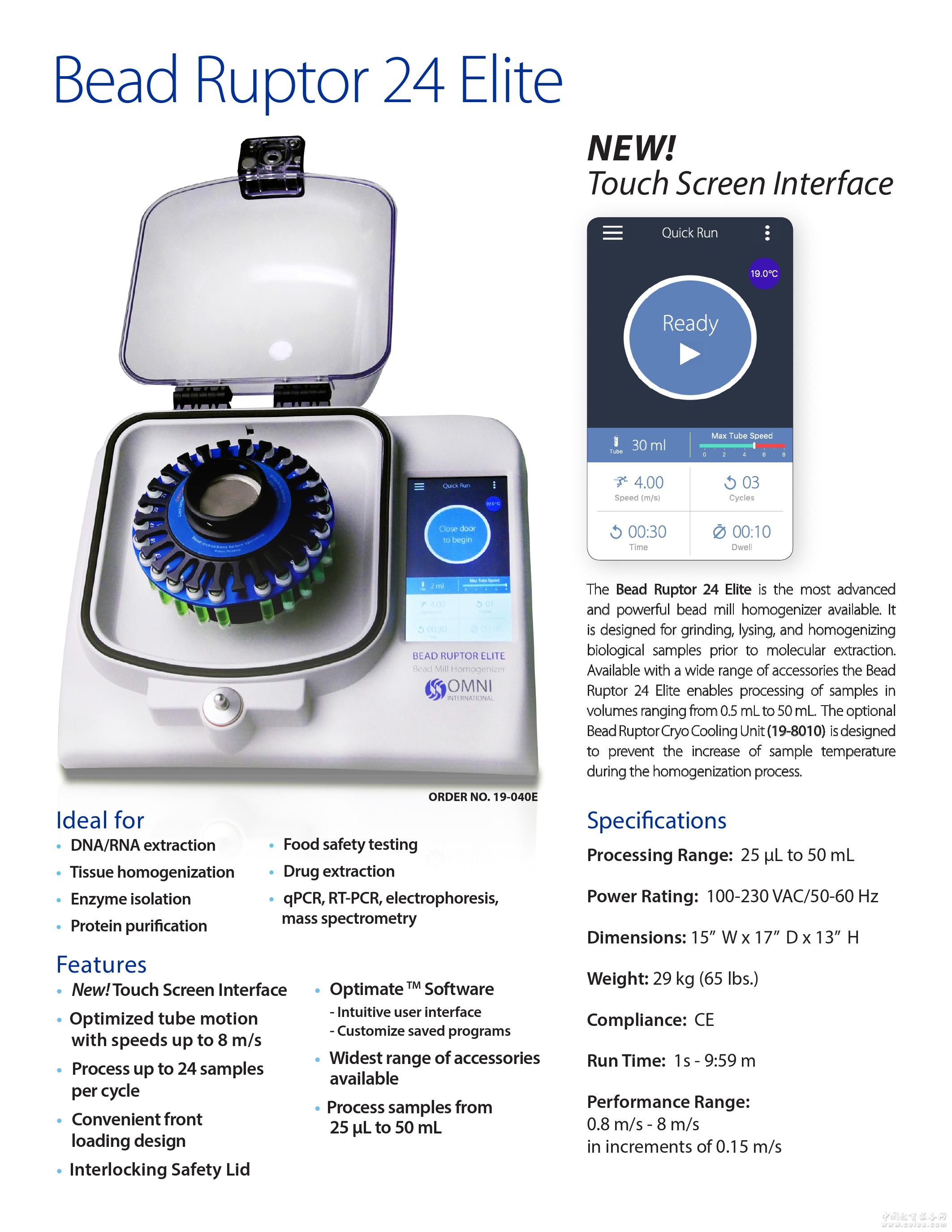 產品詳細介紹OMNI BeadRuptor24Elite多功能樣品均質器組織研磨器是一臺集研磨、裂解、均質為一體的超級靈活、超級快速和超級高效的多功能樣品均質器。它通過獨創的45度高效三維高速運動,輔助研磨珠的敲打,達到對樣品進行研磨、裂解、均質的目的。Bead Ruptor 24 Elite最大處理96個樣品管的能力。 特點: 1. 獨創的高效三維高速運動,輔助研磨珠撞擊,優化研磨珠運動減少渦流,提高處理效率減少樣品發熱可有效均質動植物組織、細菌、真菌,以及孢子、毛發、骨骼、糞便、土壤等頑固樣品, 提取DNA、RNA、蛋白、小分子藥物等成分 2. 可同時最多處理24個2ml/1.5ml/0.5ml、12個7ml、3個15ml、6個30ml、3個 50ml、96個0.1-1.2ml樣品管(需選配適配器) 3. 可使用1.5ml、15ml、50ml普通尖底離心管,耗材開放 4. 均質速度大,處理時間短(40s以內),樣品升溫小 5. 單樣品單管操作,不會出現交叉污染 6. 不僅省時省力,而且批間、批內差異更小 7. 抽提的蛋白比活更高,核酸片斷更長 8. 前置式開蓋,便捷裝載樣品 9. 運行結束后無需等待即可再次運行,提高了實驗效率 10. 對樣品溫度要求極為苛刻的用戶,有 BR-Cryo冷卻系統供選配 技術參數: 1. 均質速度0.8 - 8m/s,0.15m/s可調 2. 單個樣品處理體積范圍0.1-50ml 3. 通過 設備上的Optimate軟件可輕松直觀的設定程序,每個程序最高可設10個循環 4. 主機16G內存,可存儲100萬個程序,通 過USB接口可無限存儲程序 5. 運行時間1s-9m59s,1s可調;暫停時間0-9m59s,1s可調 6. 螺紋壓蓋固定研磨管,緊固鎖防止螺紋倒滑,使得樣品放置更方便、快捷,安全,不會發生真空壓蓋因壓力不夠脫落的危險 7. 15ml、30ml、 50ml適配器采用專利的頂珠固定技術,研磨管取放更快捷,運行更安全 8. 研磨管無需平衡,即插即用,運行穩定 9. 過溫保護,開蓋保護 10. 7英寸LCD彩色觸摸大屏,實時顯示程序進程、樣品腔溫度 11. 尺寸 (L×W×H):38.1×43.18×33cm 12. 重量:29Kg 13. 電源:100–230VAC / 50-60 Hz 14. 廠家通過ISO 9001:2008認證,產品通過CE認證 |