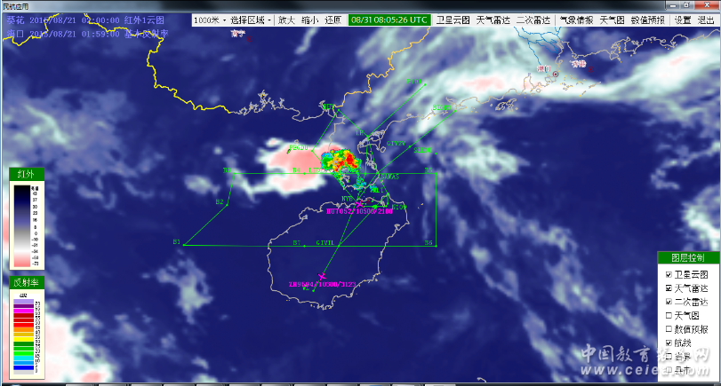 數據實時綜合顯示:把處理后的云圖圖像、氣象雷達、重要天氣預報、臺風、火山灰、航跡等數據同時顯示在統一的投影坐標系中。以相同的投影方程、參數為基礎,確保衛星云圖、天氣雷達等天氣信息與航跡信息在空間位置上的高度一致性。