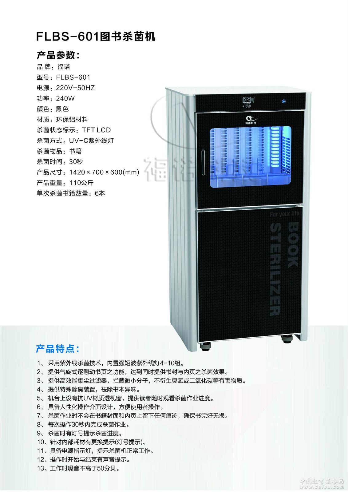 產(chǎn)品詳細介紹FLBS-601自助圖書殺菌機 你正在閱讀的圖書衛(wèi)生嗎? 很多書蟲,細菌,例如新型的甲型流感(H1N1)病毒,大腸桿菌,灰塵,霉菌和傳染性病毒的細菌駐留在圖書館的書籍里。還有些化學物質(zhì),如氨,二甲苯和甲醛是在產(chǎn)生于制造書籍的過程中,這些化學物質(zhì)是誘導癌癥的致命原因。那些常年被保存在在圖書館的圖書,是這些書蟲和細菌滋長的溫床,如果不能夠及時清理,會一定程度的損壞寶貴的藏書,也會導致人體的皮膚疾病。各種感染病毒,如新型的的甲型流感病毒(H1N1),大腸桿菌,霉菌和書蟲聚集的書籍里面誘發(fā)細菌感染,可以誘發(fā)過敏性疾病和威脅到人體的其他疾病.FLBS系列自助圖書殺菌機專門為讀書人的健康考慮,能夠完美去除各種細菌,病毒。 產(chǎn)品參數(shù): 型號 FLBS-601 電源 220V/50HZ 輸入功率 250W 殺菌方式 UV-C紫外線 殺菌物品 書籍 單次殺菌書籍數(shù)量 6本 殺菌時間 30秒 控制方式 一鍵式啟動 殺菌狀態(tài)標示 TFT LCD 產(chǎn)品顏色 黑色 外型尺寸(高*寬*深) 1420×700×600mm 柜體材質(zhì)說明 雙層環(huán)保鋁型材 產(chǎn)品重量 110公斤 產(chǎn)品特點: 1、機器滿足使用者自行操作圖書殺菌作業(yè)的功能要求; 2、機器使用工作溫度:攝氏 -10~50度。環(huán)境濕度:10%~90%; 3、采用環(huán)保鋁材料制造,更美觀。同時能達到光的二次反射,增強殺菌效果; 4、采用紫外線殺菌技術(shù),內(nèi)置強短波紫外線燈8組(含)以上。 5、提供氣旋式逐翻動書頁之功能,達到同時提供書封與內(nèi)頁之殺菌效果。 6、提供2組或以上高效能集塵過濾器,攔截微小分子,不衍生臭氧或二氧化碳等有害物質(zhì)。 7、特殊去異味過濾裝置,能收集微小分子,不衍生臭氧或二氧化碳等有害物質(zhì)。 8、采用在森林中對人體起到緩解壓力作用的100%天然植物殺菌素,增強殺菌效果,同時可去除圖書中的致癌物質(zhì)二甲苯,氨等異味 9、機臺上設(shè)有抗UV材質(zhì)透視窗,提供讀者隨時觀看殺菌作業(yè)進度。 10、具備人性化操作介面設(shè)計,方便使用者操作。 11、殺菌作業(yè)不得于書籍封面或內(nèi)頁留下刮痕或任何損害痕跡。 12、每次操作于30秒內(nèi)完成殺菌作業(yè)。 13、機器內(nèi)部設(shè)有按鍵,可以看到本機器使用累計的時間與次數(shù),同時,工作人員對消毒時間可以自行調(diào)節(jié)設(shè)置。 14、殺菌時有燈號提示殺菌進度。 15、針對內(nèi)部耗材有更換提示。 16、具備電源指示燈,提示殺菌機正常工作。 17、操作時開始與結(jié)束有聲音提示。 18、噪音小,開關(guān)噪音不高于50分貝。 19、為防止在殺菌過程中使用者打開殺菌室門,必須設(shè)有安全裝置立即暫停運轉(zhuǎn)。 20、操作界面具備警示器設(shè)計,操作完成或發(fā)生錯誤時可自動發(fā)出聲響提醒使用者。 21、產(chǎn)品外觀可根據(jù)用戶要求定制LOGO。 30秒殺菌,讓您能夠快速閱讀到干凈的圖書! (內(nèi)部圖) 電話15397165767 |