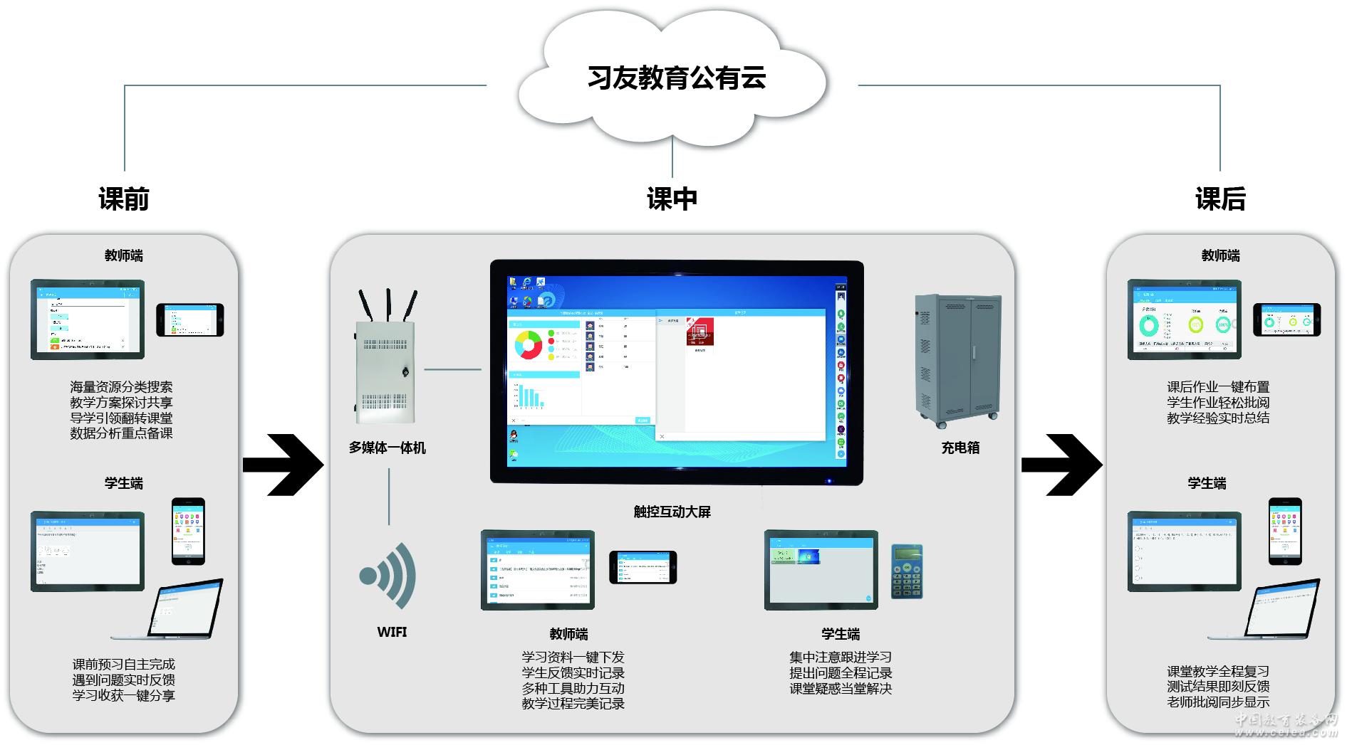 第4代新產品亮點 新增移動端備授課APP,將教學的所有環節搬進手機; 同步分類、海量資源查找更便捷,云端自動轉碼支持多類型課件資源; 學生終端全面升級,強力管控,綠色學習凈化課堂秩序; 開放智慧課堂應用與第三方應用的結合,打開更多可能; 教室內網建設組件優化升級,課中教學更流暢、更穩定; 增加非課堂教學數據采集,數據采集來源覆蓋教學全環節。