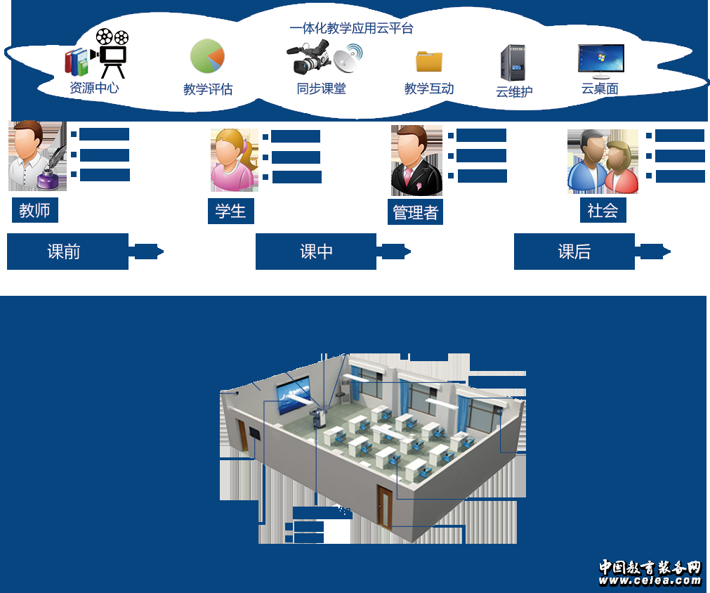 廣凌智慧教室之教室管理系統(tǒng)又分為智能教學(xué)設(shè)備管理和智能教學(xué)環(huán)境管理;智能教學(xué)設(shè)備管理可對教室內(nèi)的電腦、投影機、投影幕、音響功放、攝像頭、話筒等教輔設(shè)備進行集中控制,同時支持移動APP控制,任何移動設(shè)備均可輕松控制教學(xué)設(shè)備;對教室及設(shè)備狀態(tài)遠程監(jiān)看和管理、智能投影儀使用狀況分析、智能投影儀使用狀況分析、到課率、在堂率自動統(tǒng)計等。