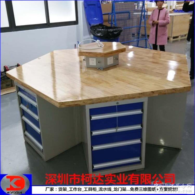 產品詳細介紹常規標準六角工作臺詳細參數 專業制造六角工作臺/鉗工臺 *尺寸:2400*1200*800,每個工位邊長為1200mm,臺面采用50mm厚的綠色高分子復合桌面; *臺面下部配置六個工具柜600×540×750mm;工具柜配置4個抽屜,抽屜大小一般為:2×100mm,1*150mm,1*200mm,每抽承重80kg,可85%抽出。 *柜體采用1.2mm厚優質冷軋板精工制作而成。 *臺面上一般可配4寸或6寸或8寸大小的6個臺虎鉗 *表面為烤漆處理,顏色一般為綠色或藍色
