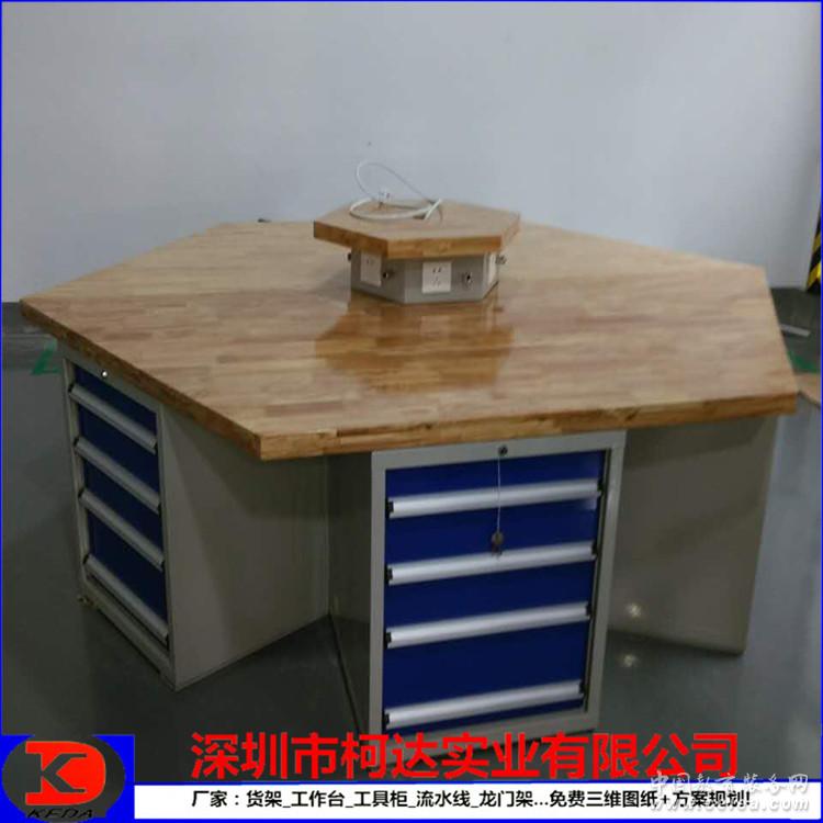 常規(guī)標準六角工作臺詳細參數(shù) 專業(yè)制造六角工作臺/鉗工臺 *尺寸:2400*1200*800,每個工位邊長為1200mm,臺面采用50mm厚的綠色高分子復合桌面; *臺面下部配置六個工具柜600×540×750mm;工具柜配置4個抽屜,抽屜大小一般為:2×100mm,1*150mm,1*200mm,每抽承重80kg,可85%抽出。 *柜體采用1.2mm厚優(yōu)質冷軋板精工制作而成。 *臺面上一般可配4寸或6寸或8寸大小的6個臺虎鉗 *表面為烤漆處理,顏色一般為綠色或藍色