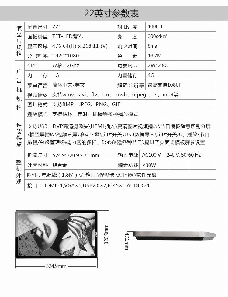 中銀(BOCT)22英寸LED背光高清商用廣告機