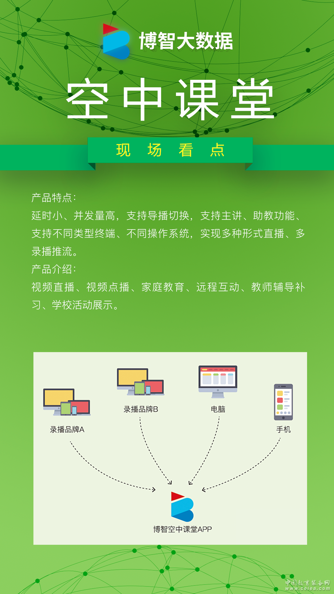 產(chǎn)品詳細(xì)介紹博智空中課堂通過rtmp標(biāo)準(zhǔn)協(xié)議,實(shí)現(xiàn)多錄播推流,支持視頻資源目錄自定義、客戶端支持局域網(wǎng)大規(guī)模直播無延遲、支持8錄視頻通過軟件導(dǎo)播切換,支持主講、助教功能。可以通過手機(jī)、電腦、攝像頭直播推流、實(shí)現(xiàn)多種形式直播。 產(chǎn)品特點(diǎn): 延時(shí)小、并發(fā)量高,支持導(dǎo)播切換,支持主講、助教功能、支持不同類型終端、不同操作系統(tǒng),實(shí)現(xiàn)多種形式直播、多錄播推流。