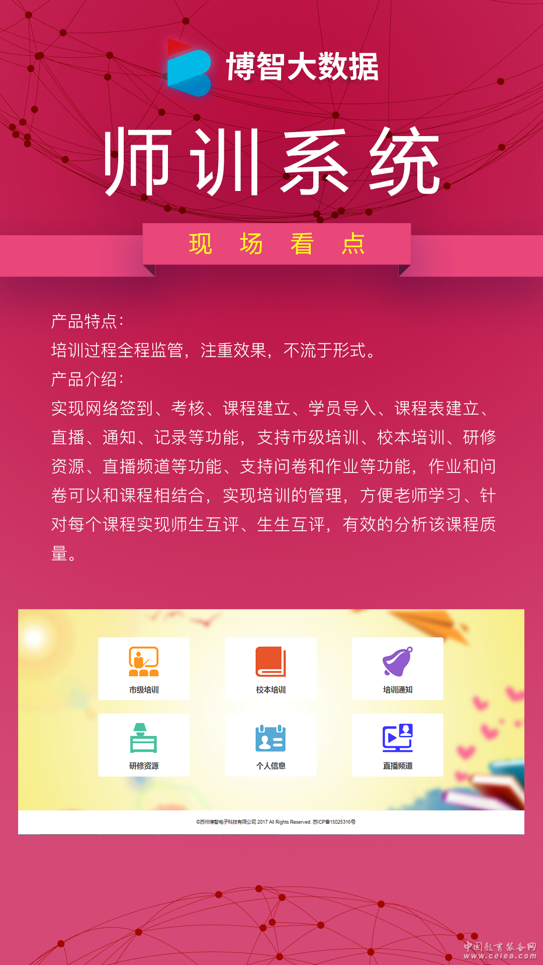 產(chǎn)品詳細(xì)介紹實(shí)現(xiàn)網(wǎng)絡(luò)簽到、考核、課程建立、學(xué)員導(dǎo)入、課程表建立、直播、通知、記錄等功能,支持市級(jí)培訓(xùn)、校本培訓(xùn)、研修資源、直播頻道等功能、支持問卷和作業(yè)等功能,作業(yè)和問卷可以和課程相結(jié)合,實(shí)現(xiàn)培訓(xùn)的管理,方便老師學(xué)習(xí)、針對(duì)每個(gè)課程實(shí)現(xiàn)師生互評(píng)、生生互評(píng),有效的分析該課程質(zhì)量。 產(chǎn)品特點(diǎn): 培訓(xùn)過程全程監(jiān)管,注重效果,不流于形式。