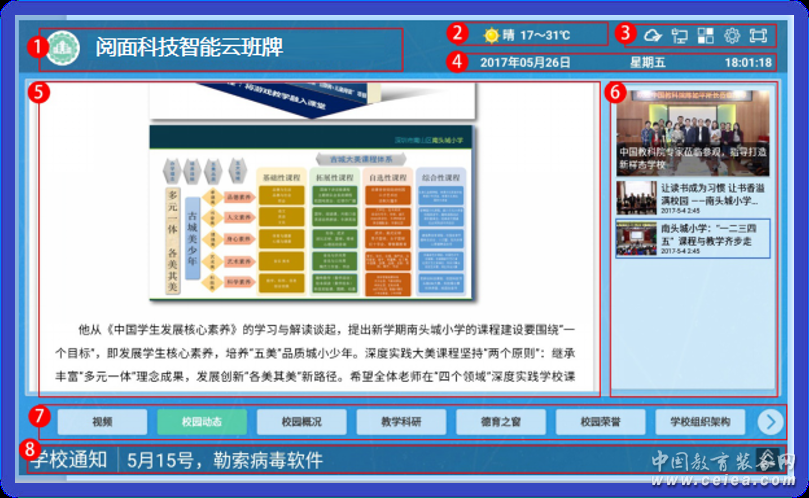 產(chǎn)品詳細(xì)介紹 ①顯示學(xué)校校徽及學(xué)校名稱; ②顯示當(dāng)天的當(dāng)?shù)兀ń壎ǖ貐^(qū))天氣情況; ③推送狀態(tài)標(biāo)識/網(wǎng)絡(luò)狀態(tài)標(biāo)識/應(yīng)用中心/系統(tǒng)設(shè)置/全屏顯示;(圖標(biāo)從左到右排序) ④顯示當(dāng)前的日期、星期、時間內(nèi)容; ⑤內(nèi)容顯示欄,顯示各模塊的內(nèi)容; ⑥模塊內(nèi)容標(biāo)題欄目列表,顯示模塊內(nèi)容標(biāo)題及縮略圖,可上下滾動; ⑦菜單欄目,顯示各個各模塊的名稱;可左右滑動查看,也可點(diǎn)右邊的”箭頭“實(shí)現(xiàn)查看右邊隱藏的模塊; ⑧學(xué)校通知欄目,顯示學(xué)校通知內(nèi)容(僅顯示文字,圖文需點(diǎn)擊“更多”查看),“更多”顯示學(xué)校通知?dú)v史消息。