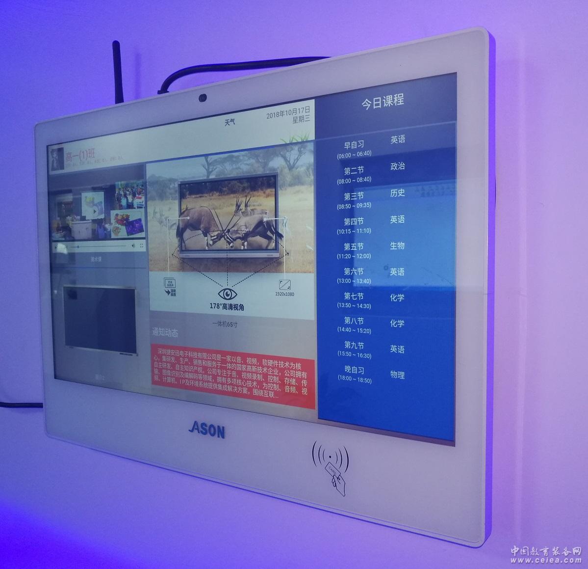 尺寸:21.5” 顯示區域:47.6cmX26.8cm (V) 點距:0.08275 mm x 0.24825 mm 最佳分辨率:1920*1080RGB 顯示比例:16:9 亮度:3 450cd/㎡ 對比度:1000:1(Typ.)透射 亮度均勻性>70%;響應時間6.0ms;顯示色彩8 bit/16.7 Billion 背光源:LED;屏壽命:3 50000 小時 系統3188 瑞芯微;RAM2G;內存8G;WIFI:可選配;接口:SB*2/RJ45*1/SD*1/VGA*1/HDMI*1 操作系統:2017/3/27 電子:喇叭2x5W;供電:DC:12V2.5A(電源內置) 看門狗:死機后自動重啟;電容屏:10 點;攝像頭:200W,可視角 88 度以上 讀卡器:頻率:13.56MHz;支持 IC 射頻卡 整機外觀:表面鋼化玻璃、邊框型材、標準壁掛架帶;防盜、后殼散熱設計。 --------------------------------------------- 隨著教育信息化建設的不斷深入,在教育行業推行全面信息化改革的驅動下,電子班牌作為一個連接學生與班級學校的優良載體,能極大的增強教學雙方的信息互動,高效便捷的傳遞各種知識及通知信息,實現班級學校與學生之間的無縫交流。 捷安迅電子班牌在繼承了傳統班牌的優勢下,對班牌界面和信息顯示做了深入的優化,通過班牌,可方便快捷的了解班級、班級相冊、天氣、校園節目、通知動態、今日課程等相關信息。讓學生一目了然,極大的拓寬了校園信息化的技術環境。同時使班級、校園文化建設更加生動具體。 系統組成: 使用場景:校內