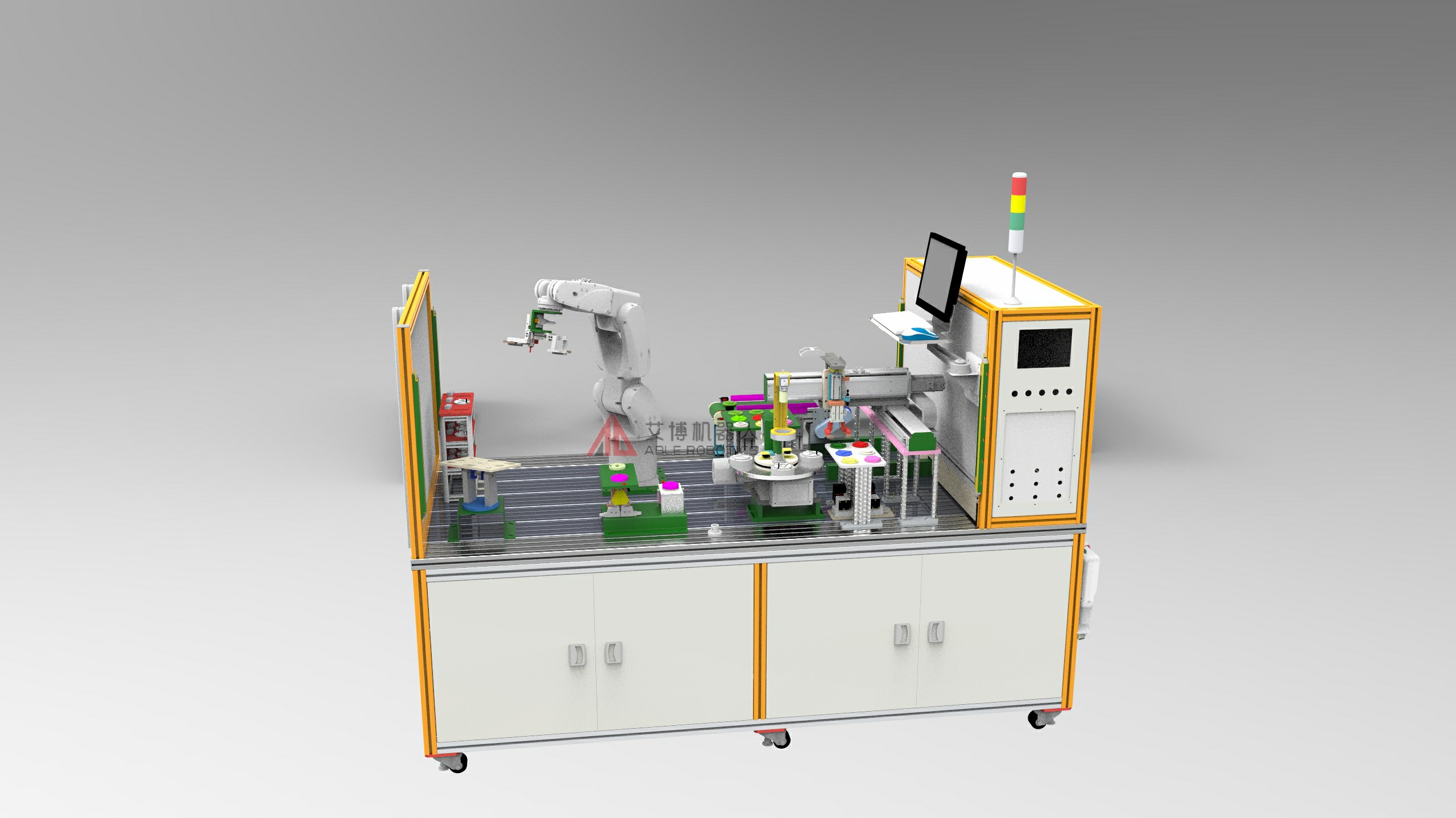 高配版機器人編程工作站所具有的工業機器人實際應用,占非自動化領域達90%以上。工業機器人編程工作站是一個具有完整的自動化生產工藝,由工業機器人軌跡描繪、機器人工業組裝、機器人編程碼垛、XYZ坐標機械手編程化控制、視覺檢測應用、觸摸屏編程及PLC編程設計等一系列自動化行業常用裝置組成的一套完整的工業教學應用系統。不僅具有一套完整工藝生產系統,而且還具有很強自定義拓展靈活性,用戶可根據自身的教學需求進行調整。