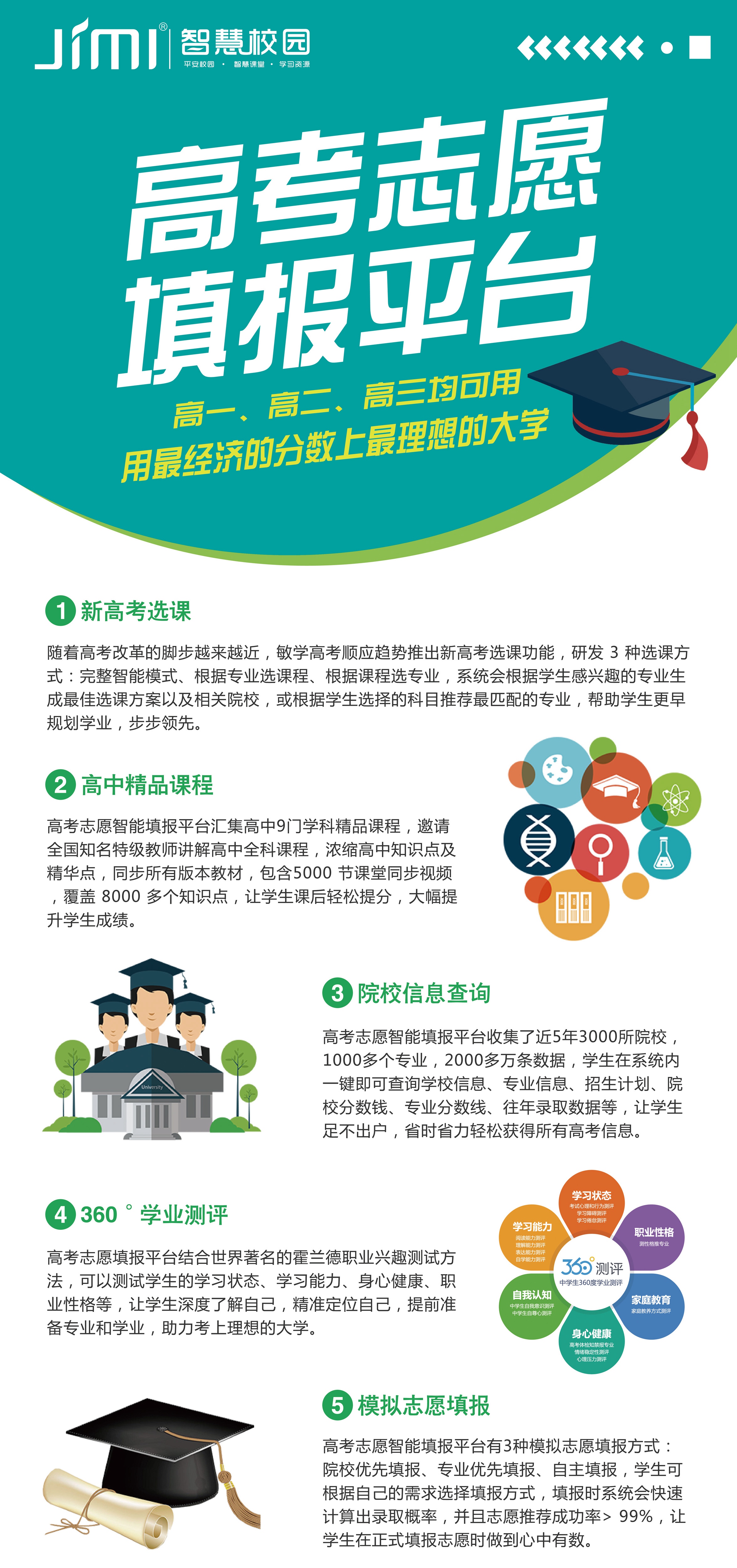 為每年一度的高考考生提供高考志愿填報指南、院校智能推薦、志愿模擬填報、高考志愿講堂、高考資訊、學業測評等學習服務,幫助考生用最經濟的分數上到最理想的大學和專業。