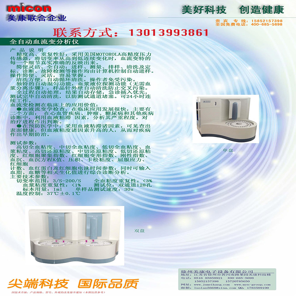 產品詳細介紹設備故障自動診斷功能:硬件故障測試,氣路密封性、壓力采樣、管路清潔度等檢測。 信號采集:采用高精度自動跟蹤液面微分捕獲控制技術,計算機完成系統數據分析處理。 無磨損測試:測試主體無運動部件,故障降低、使用壽命長 樣品異常報警功能:測試過程中樣品質量(如溶血、血凝塊、異物等)異常,設備自動報警提示。 管路污染檢測功能:可實現檢測系統清潔程度自動判別,永不堵孔。 血流變分析儀全自動:自動定位、自動吸樣、自動測量、自動排樣自動清洗、自動定標、自動智能診斷。 二、測試項目: 血流變分析儀檢測項目:全血粘度(高切、中切、低切),血漿粘;血沉,壓積: 換算項目:還原粘度(高切、中切、低切)紅細胞聚集指數,紅細胞變形指數.剛性指數,血沉方程K值,卡森粘度屈服應力,紅細胞計數,血紅蛋白及紅細胞電泳時間等 分析項目:可輸入纖維蛋白原及高密、低密、膽固醇、血糖等相關生化指標進行綜合分析。 報告:開放式自定義報告單模式,報告單存儲數量不受限制 三、技術指標: 血流變分析儀切變率范圍:1/s 200/s 粘度范圍:0mpa s 50mpa s 檢測溫度:37℃±0.1℃ 重復性誤差:全血高切≤1.O% 全血低切≤1.5% 血漿≤1.5% 測試速度≥80T/H 標本用量:≤1.0ml數據輸出:Rs-232串口接口 電源:一220v 50Hz 功率:200W 血流變分析儀工作環境:溫度5℃-35℃,相對濕度不大于85% 血流變儀 產品簡介