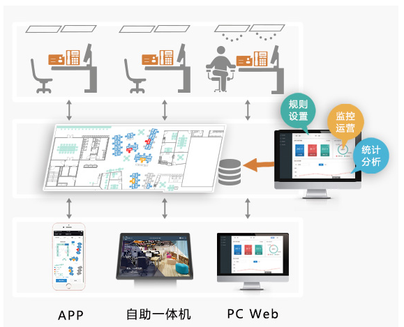 n 實時地圖與導航技術,通過管理平臺中辦公區內自動導覽技術,自動引導您前往預定或指定的辦公區域。