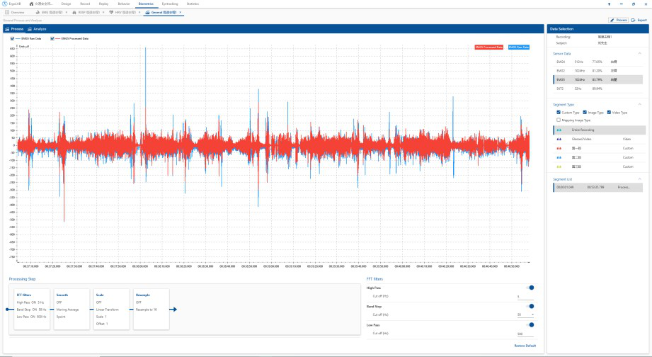 產品詳細介紹肌電信號分析 肌電信號(Electromyogram)簡稱EMG,反映神經肌肉興奮性,評估神經與肌肉的功能狀態?捎糜诩∪夤ぷ鞯墓ばW分析、安全操作姿態分析、康復狀態功能評價、疲勞識別以及肌電假肢控制等動作模式研究等。 ErgoLAB肌電分析軟件自動對原始數據進行濾波降噪處理,根據MVC進行數據歸一化與統計分析。時域分析包括原始數據、處理數據、歸一化數據的Mean、Max、Min、SD、Variance、RMS、Mean Absolute Value、iEMG等指標;頻域分析的中值頻率、均值頻率、可視化頻譜圖,系統支持自動識別周期性動態用力分析。 EMG高級數據處理分析模塊可以結合人機環境同步平臺和生理記錄系統采集到與EMG指標相關的生理信號進行離線處理和分析?蓪π盘栠M行自由選擇、放大、縮小,便于瀏覽數據;在整體呈現數據的基礎上,還可以根據片段、事件、場景三種分割方式進行數據呈現與分析;可導出ASCII格式的原始數據、處理后數據和分析后數據;并可導出可視化分析報告。