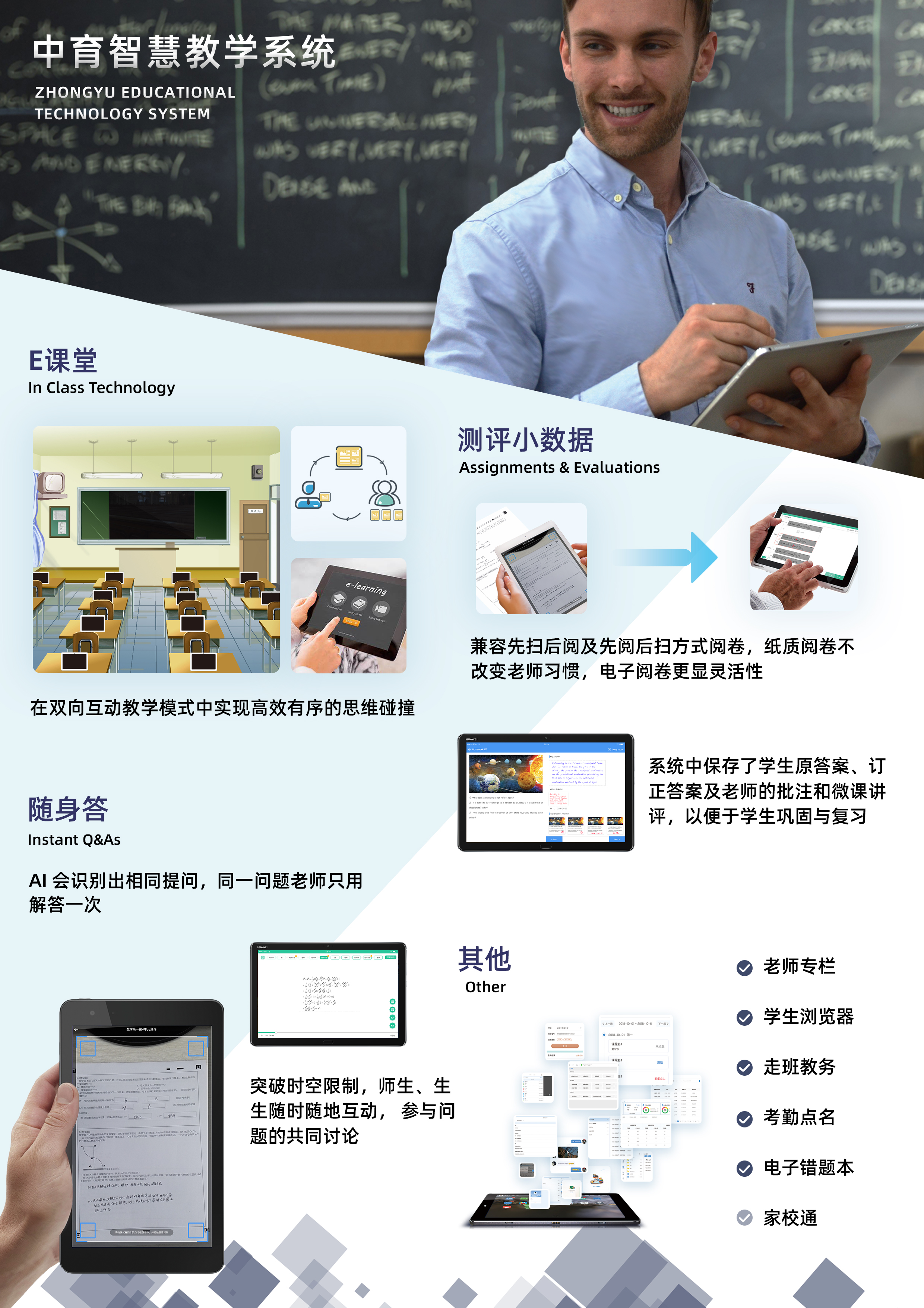 產品詳細介紹現已推出面向中小學日常教學所需的整套教學系統,涵蓋上課、作業考試、課后答疑等教學各環節。在合作的學校內實現了師生人手一臺平板的常態化使用。有效減輕了老師教學負擔,提高了學生學習效率。