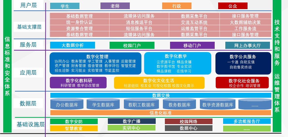 2個統一:管理、教學、科研、生活、文化、服務等多方面應用在WEB端和移動端全面統一。