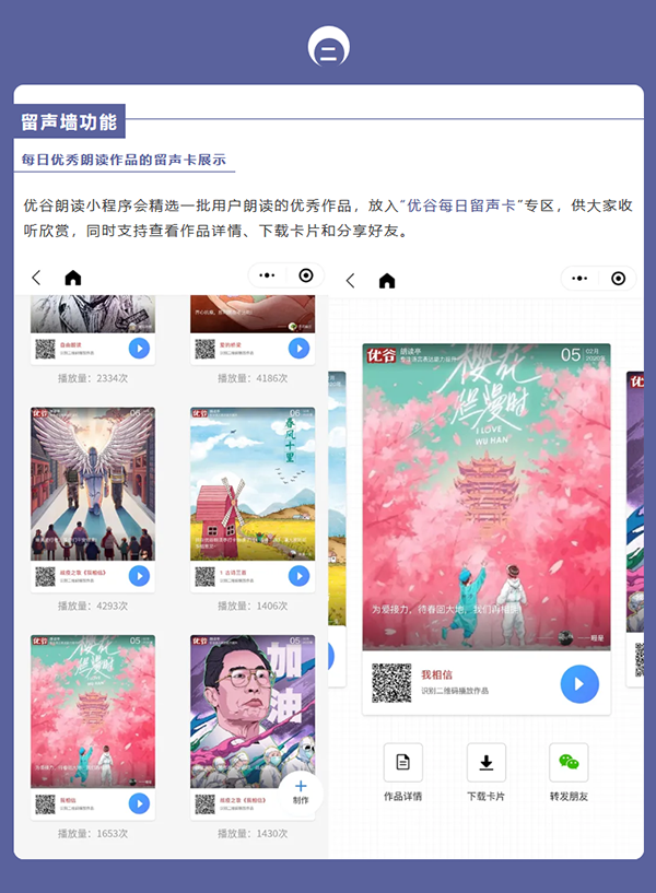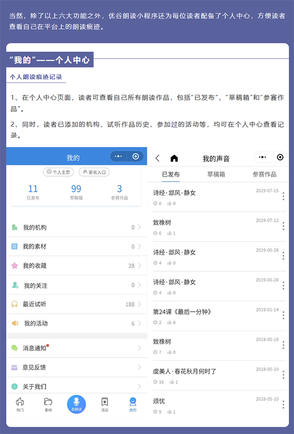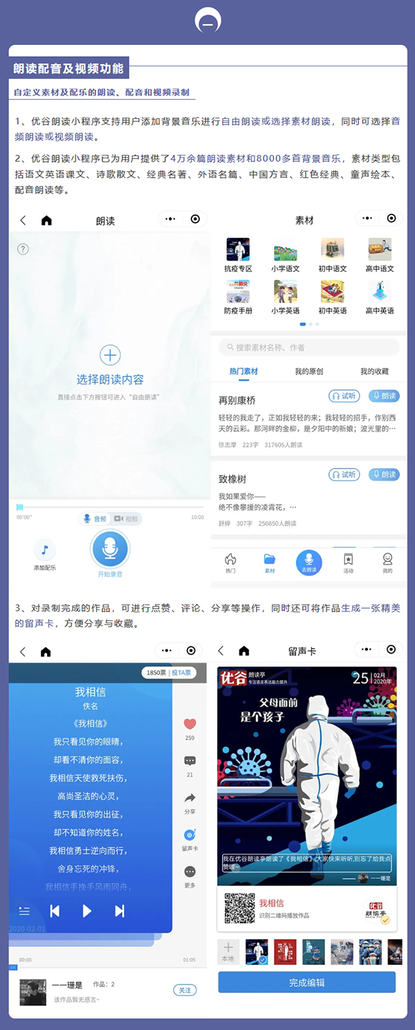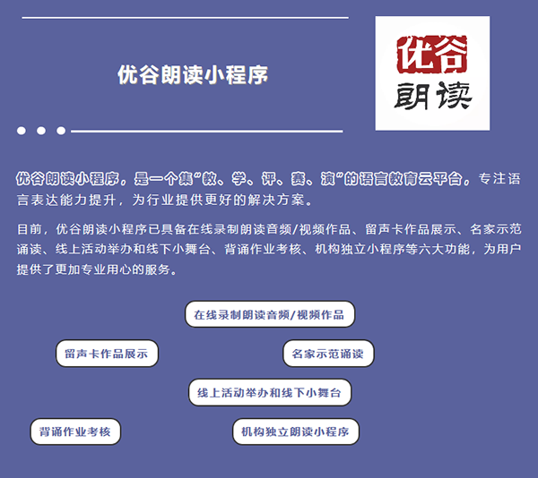 目前,優谷朗讀小程序已具備在線錄制朗讀音頻/視頻作品、留聲卡作品展示、名家示范誦讀、線上活動舉辦和線下小舞臺、背誦作業考核、機構獨立小程序等六大功能,為用戶提供了更加專業用心的服務。