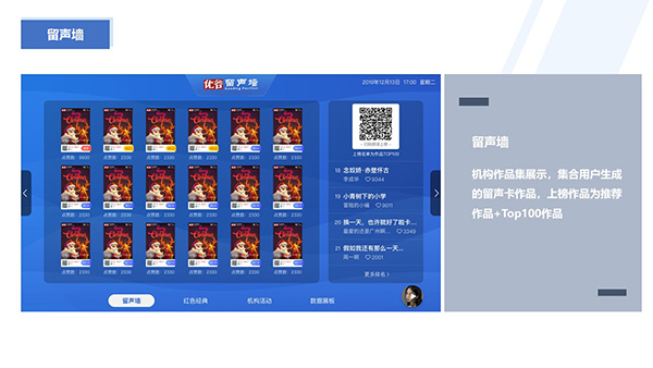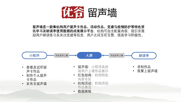 優谷留聲墻,是一款集機構用戶留聲卡作品、活動作品、黨建與疫情防護等特色資訊學習及朗讀亭使用數據的成果展示平臺,機構可自主配置內容,指引并激勵用戶朗讀練習及關注黨建等信息,用戶之間互聽互贊,提高學習積極性。