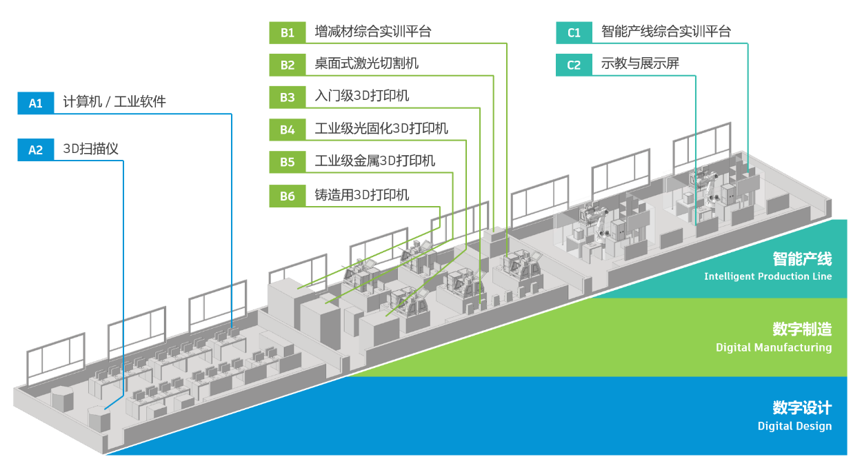 “未來智造中心”項目以數字技術貫穿設計制造全過程,培育智能制造技能人才。項目包含數字設計、數字制造、智能產線三個方面的內容。