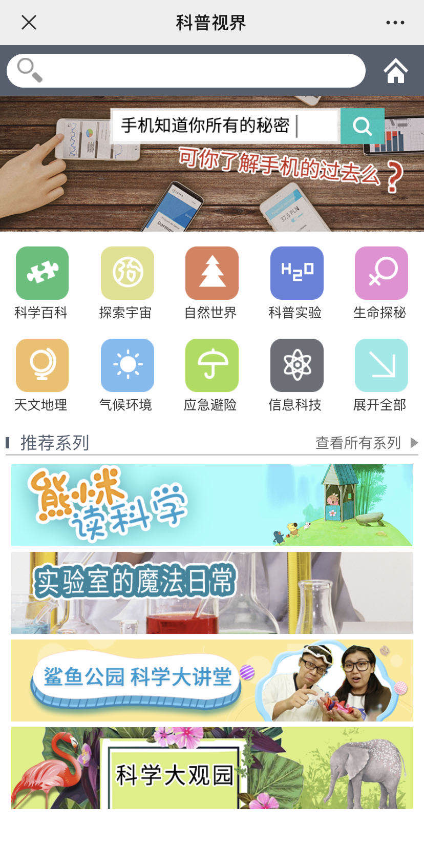 我們的微信移動端包含的產品主要有:科普視界、少兒數字圖書館、學前教育知識庫、中小學數字圖書館。