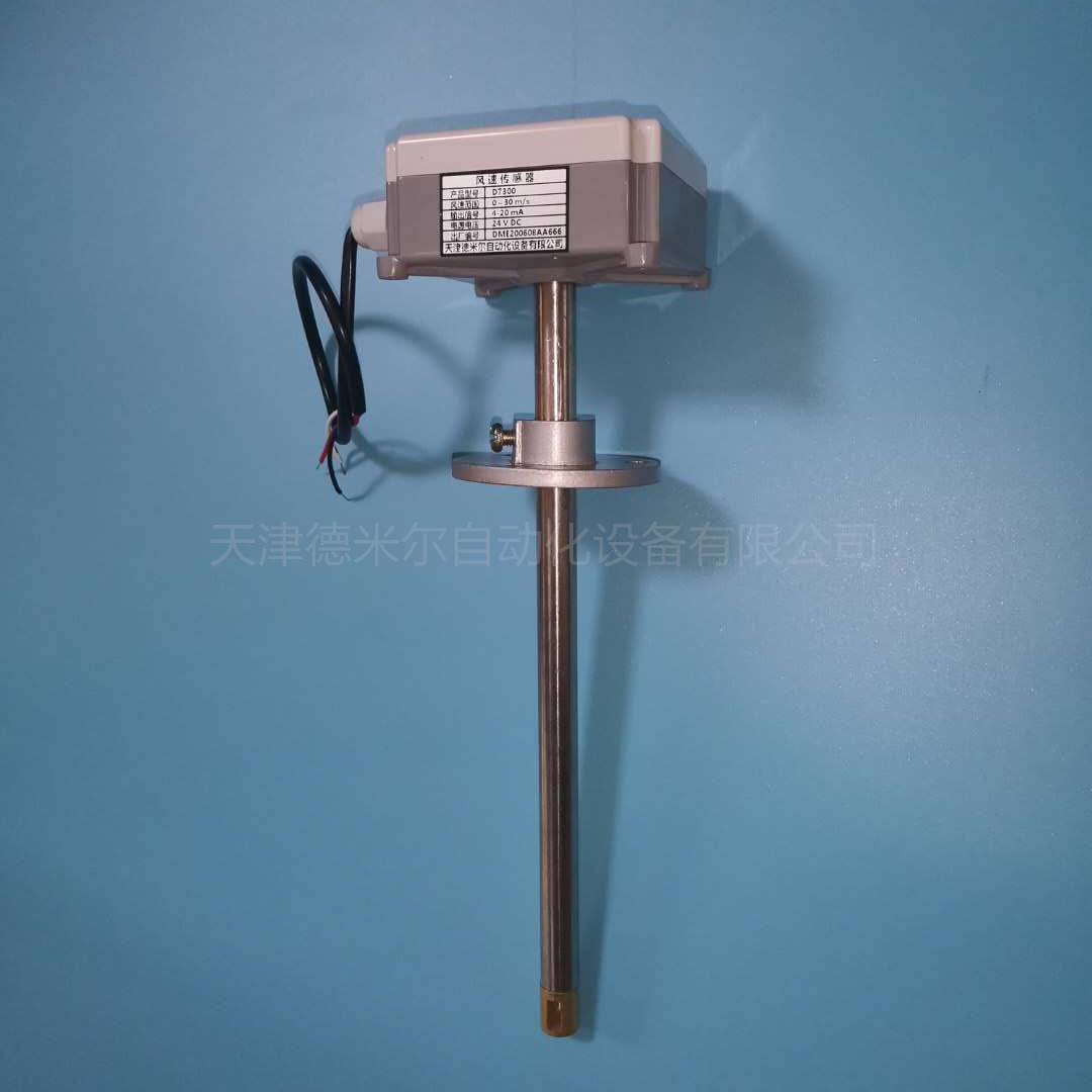 產品詳細介紹風機通風管道空調風速傳感器/變送器 產品簡介 天津德米爾自動化設備有限公司主打產品---D7300風速傳感器,D7301高溫風速傳感器,采用全量程精確標定,溫度補償和線性補償均為數字化實現,分辨率高,無零點漂移,測量準確,長期穩定性好。 產品為不銹鋼探桿,普通型長度為200mm、250mm,高溫型長度為300mm、400mm,其他長度均可定制,分為一體式和分體式兩種外形,法蘭固定,插入式安裝,測量范圍0-5m/s-10m/s-20m/s-30m/s-40m/s-70m/s,普通型風速和風量兩種測量模式供客戶設定切換。測量風量需設置管道面積,直接讀取風量數值,無需計算。 廣泛適用于高溫煙道、工業廢氣、酸堿性氣體、HVAC、暖通空調、中央空調、通風系統、紡織化工、樓宇自控、生物醫藥、過程和環境控制等風速風量測量。 安裝位置 工作原理 安裝位置:選用直管段前5后3原則 工作原理: 1. 熱式風速傳感器:以熱絲(鎢絲或鉑絲) 或是以熱膜(鉑或鉻制成薄膜) 為探頭,裸露在被測空氣,并將它接入惠斯頓電橋,通過惠斯頓電橋的電阻或電流的平衡關系,檢測出被測截面空氣的風速。 2. 皮托管風速傳感器:是測量氣流全壓和靜壓以確定氣流速度的一種管狀裝置,采用差壓式原理。 技術參數 測量介質:空氣 工作溫度:-10-60℃ 介質溫度:-20-120℃; 超過120℃推薦使用D7301皮托管風速/風量變送器,可耐溫700℃ 風速范圍:0~5m/s......0~20m/s......0~40m/S..... 0~70m/s......(多種量程可選擇) 風量范圍:0~9999m3/min(換算成小時是600000m3/h) 分 辨 率:0.1m/s,0.01m/s 精 度:0.2m/s + 3%*mv 顯示方式:4位液晶數字 輸出方式:電流4~20mA;電壓0~10V;RS485(MODBUS)(三者選其一) 耗 電 流:<50mA 供電電壓:24VDC/AC( ±20%),(其中AC只適用于電壓輸出型) 探 桿:ABS/不銹鋼 探桿長度:防腐型(ABS):150mm;高溫型(不銹鋼):200mm,250mm(可定制) 外 殼:ABS 防護等級:IP54 重 量:0.65KG