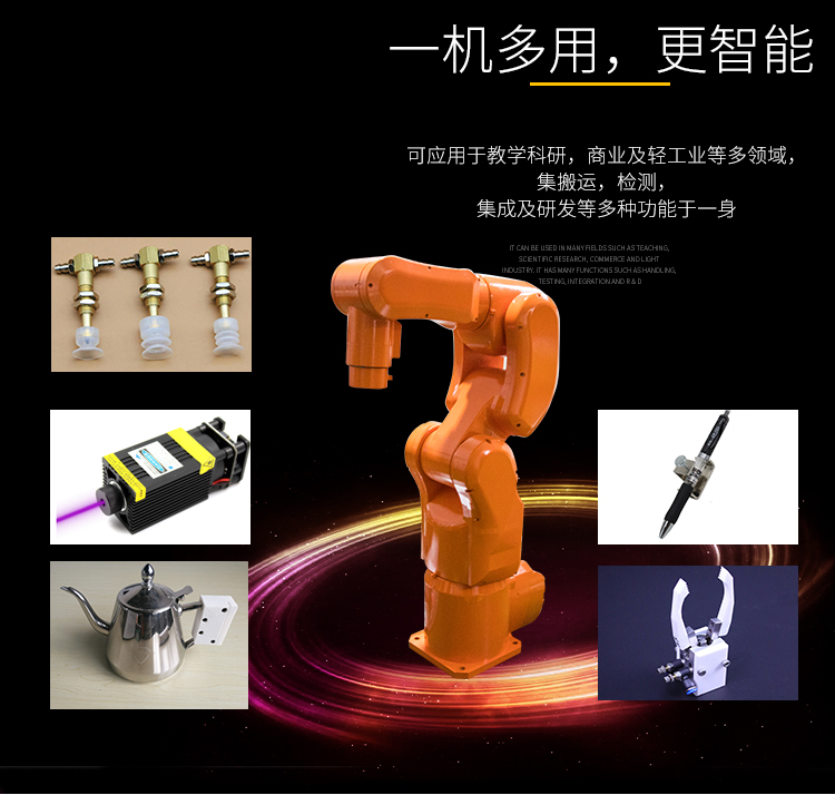 產品詳細介紹輕量化、微型化、功能全;是濃縮了企業一線制造車間用的工業機 器人所有的基本功能,真實的機器人控制系統,與 ABB/安川等品牌機器人編程語言規 則相似,提高學生編程能力。可搭配舞獅服飾或寫字夾具、吸盤,用于娛樂或觀賞應用 編程學習和機器人寫字或搬運碼垛編程應用。六自由度機器人是一款針對高校教學應 用開發的六軸機器人。機器人結構緊湊、體積小、重量輕、其最大負載 5KG,臂展活動 范圍540mm。腕部采用中空結構,走線更方便、動作更靈活 |