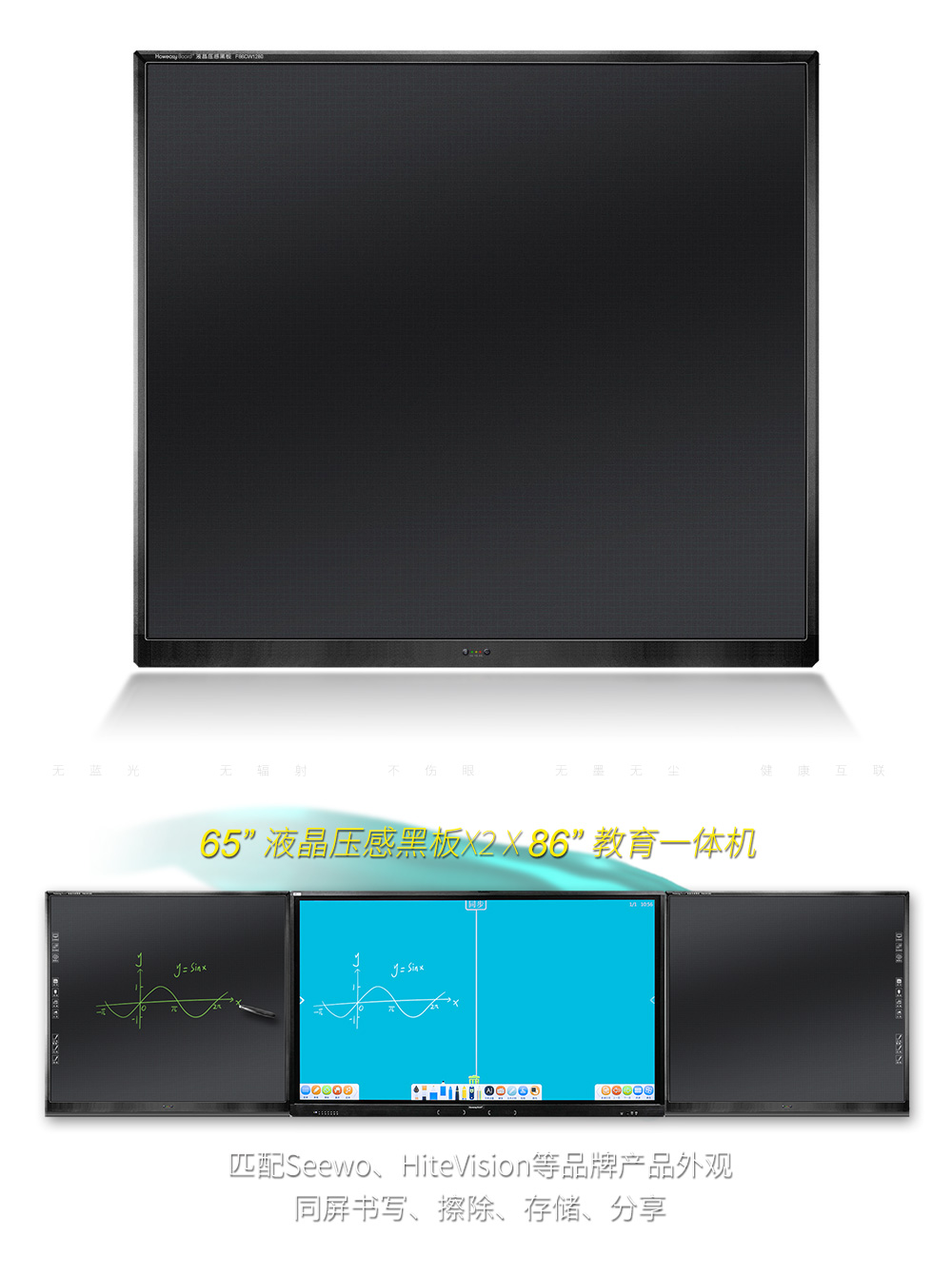 65寸液晶壓感黑板面板貼敷柔性液晶書寫膜,支持壓感書寫,甚至是手指直接書寫,筆跡粗細(xì)和書寫流暢度,完全媲美傳統(tǒng)粉筆的書寫效果。支持一鍵清除、局部擦除和健康互聯(lián)。無藍(lán)光、無輻射、不傷眼,無墨無塵。