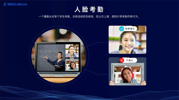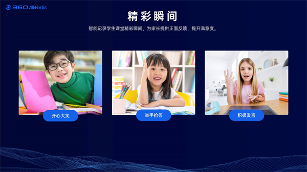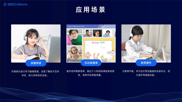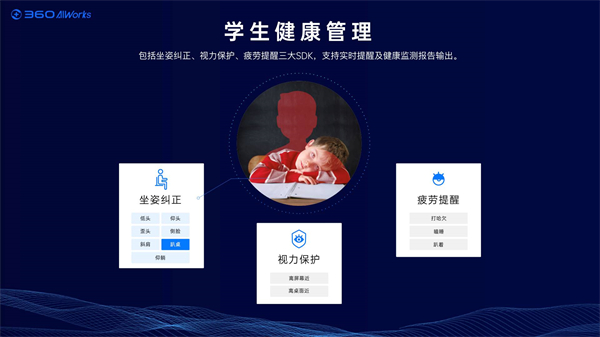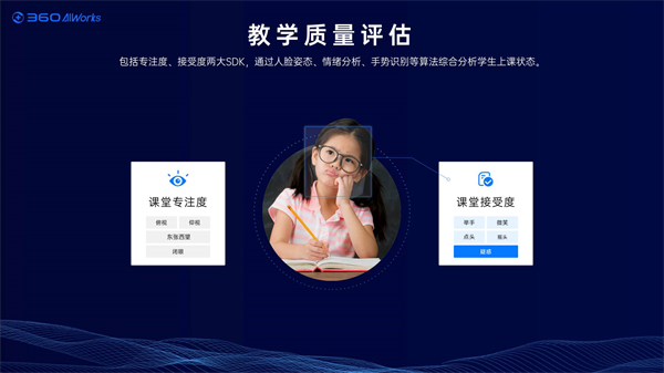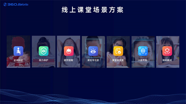 360在線教育AI學情分析學生端解決方案包括課堂專注度分析、課堂接受度分析、人臉考勤、坐姿糾正、視力保護、疲勞提醒、精彩瞬間視頻等,適用于線上直播、錄播課,及各種教育硬件學習場景。
