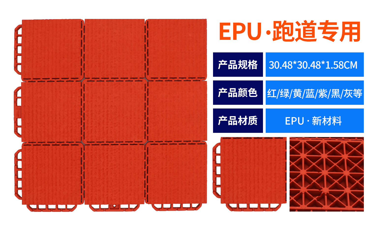 產品詳細介紹產品規格:30.48cm*30.48cm*1.3cm 產品顏色:紅色、草綠、綠色、藍色、黃色和天藍色 產品材料:復合高分子熱塑性彈性體材料 產品克重:800 克 適用場地:全民健身及高端大中小學運動場地、跑道、操場 產品分級:專業級 產品質保:3 年