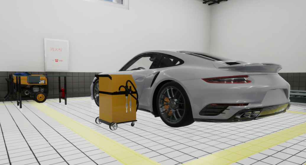 軟件按照1:1真實比例還原實訓場景,給操作者帶來極高的沉浸感。以VR體驗的方式,通過定位追蹤器定位使用者的位置,通過手柄與場景中的物體進行交互以模擬真實的汽車鈑金、噴漆操作,使用者帶上頭顯即可進行逼真體驗,配合手柄操作以及3D環繞立體聲可以真實地模擬現場感覺。在場景里使用者根據系統的提示一步步跟隨操作,又搭配有真實的場景及物理引擎,可以使汽車鈑金、噴漆的學習事半功倍。