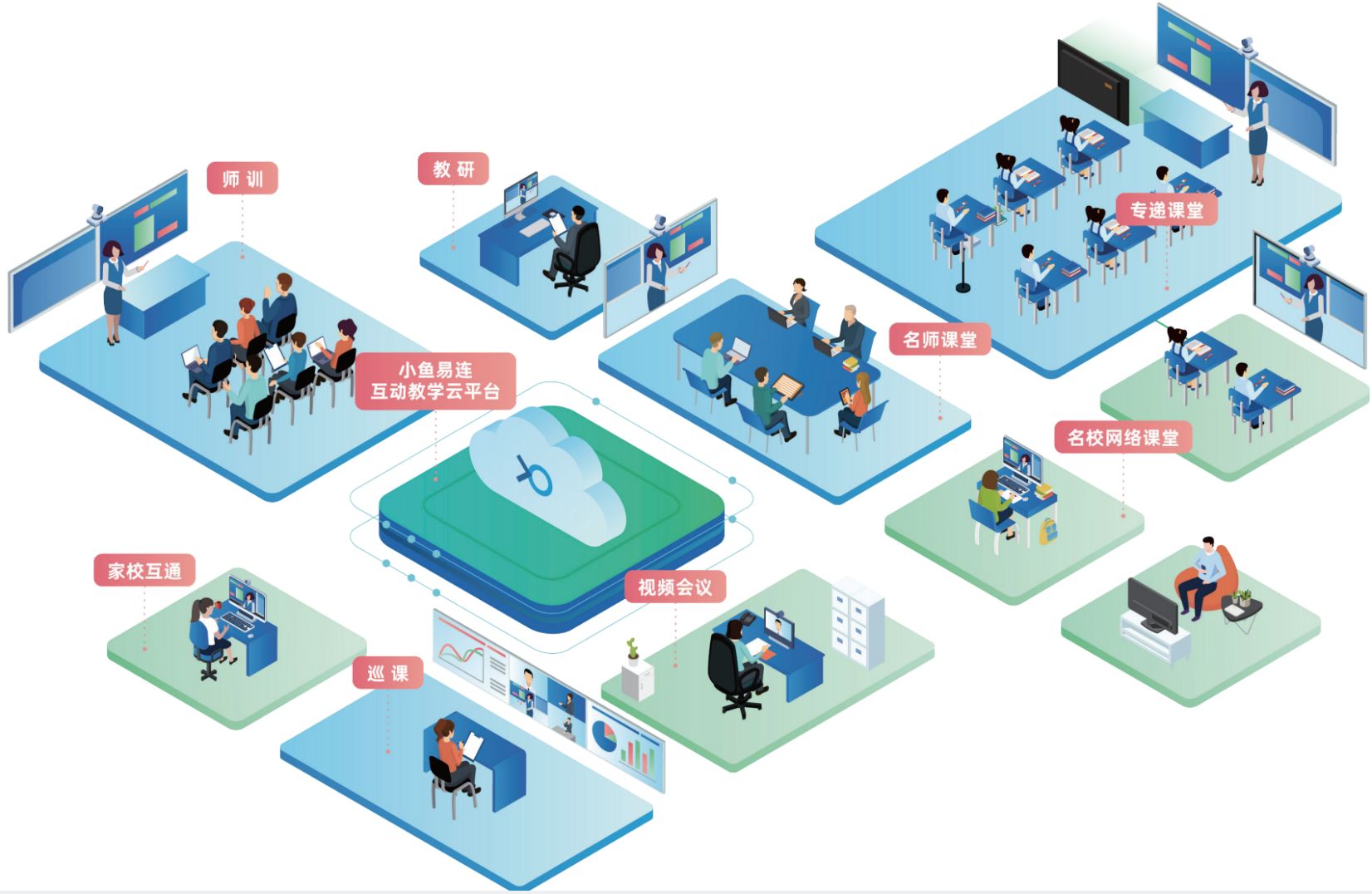 小魚易連打造教育全融合視頻互動解決方案,實現互動、直播、點播、資源分享、教學管理、AI 智能等多場景融合應用,推動教育優質資源服務新生態的構建,利用智能化云視頻技術協助區域教育信息化從 2.0 時代向 3.0 時代過渡,解決區域教育信息化發展不平衡、教育資源供給不充分、信息化應用水平不高等難題。