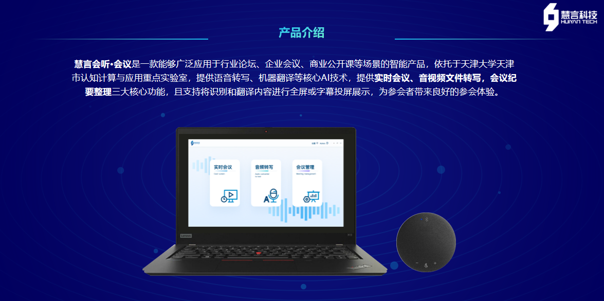 產品詳細介紹慧言會聽·會議是一款能夠廣泛應用于行業論壇、企業會議、商業公開課等場景的智能產品,依托于天津大學天津市認知計算與應用重點實驗室,提供語音轉寫、機器翻譯等核心AI技術,提供實時會議、音視頻文件轉寫,會議紀要整理三大核心功能,且支持將識別和翻譯內容進行全屏或字幕投屏展示,為參會者帶來良好的參會體驗。 |