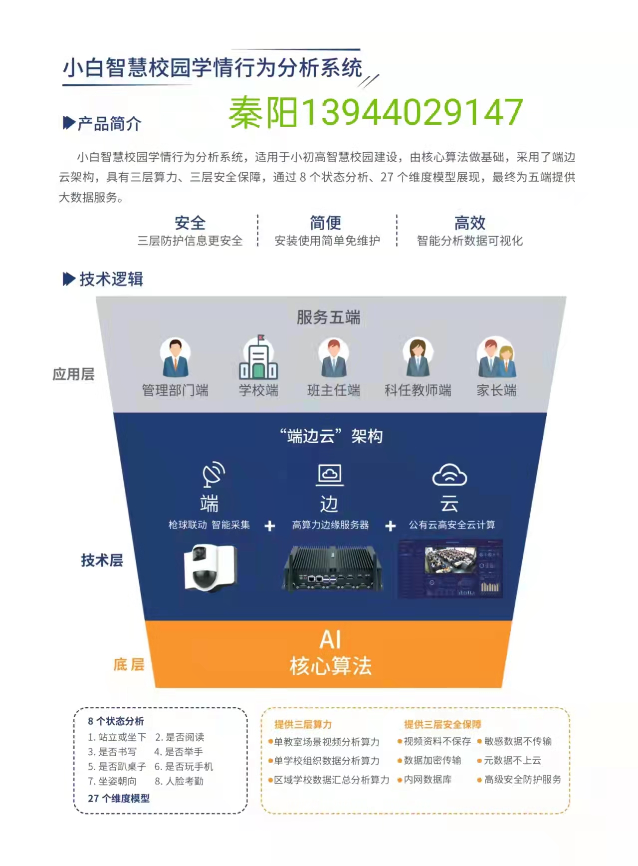 產品詳細介紹智慧校園學情行為分析系統,適用于小初高智慧校園建設,通過8個狀態分析,27個維度展現,最終為五端提供數據。五端包括:教育管理部門,學校校長,班主任,科任老師,家長服務