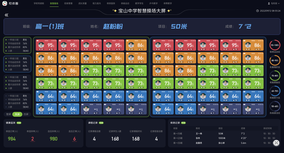 運動數據分析、運動直播課、運動榮譽墻、測試錄像回看等應用的智能體育教育大屏,智慧屏即時展現各種體質測試數據、擁有豐富而強大的體育教學資源和即時性。