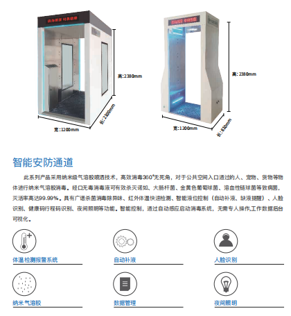 產品詳細介紹此系列產品采用納米級氣溶膠噴灑技術,高效消毒360°無死角,對于公共空間入口通過的人、寵物、貨物等物體進行納米氣溶膠消毒。經口無毒消毒液可有效殺滅諾如、大腸桿菌、金黃色葡萄球菌、溶血性鏈球菌等致病菌,滅活率高達99.99%。具有廣譜殺菌消毒除異味、紅外體溫快速檢測、智能液位控制(自動補液、缺液提醒)、人臉識別、健康碼行程碼識別、夜間照明等功能。智能控制,通過自動感應啟動消毒系統,無需專人操作,工作數據后臺 可視化。 |