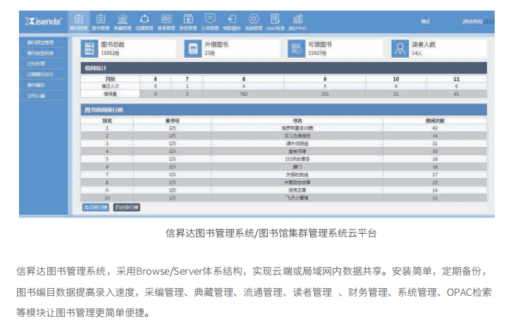 信昇達圖書館管理系統采用Browse/Server體系結構,實現云端或局域網內數據共享。安裝簡單,定期備份,圖書編目數據提高錄入速度,采編管理、典藏管理、流通管理、讀者管理、財務管理、系統管理、OPAC檢索等模塊讓圖書管理更簡單便捷。