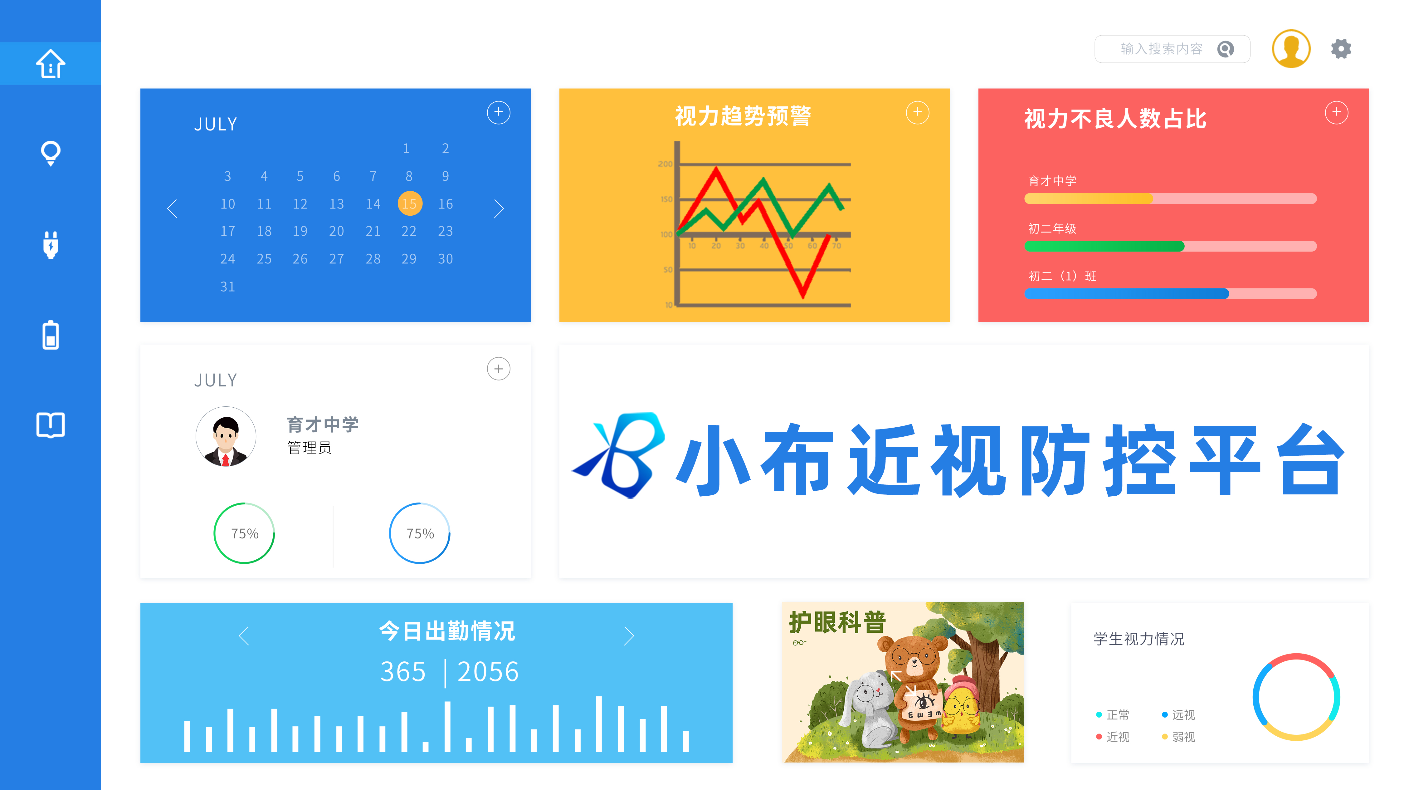 【綜合防控平臺】:分級多終端一體化平臺,對學生視力數據深度分析并預警近視趨勢,助力各級聯動防控。 【科普教育】:提供專業近視科普教育內容,提高學校及學生近視防控意識。 為學生近視防控提供一體化、全系統解決方案,實現近視早預防、早發現、早干預。