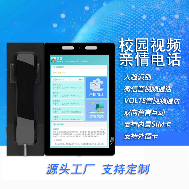 產(chǎn)品詳細(xì)介紹產(chǎn)品功能: 1.家校互動:學(xué)生“刷臉”即可與家長進(jìn)行音視頻通話,支持雙向留言互動。“指定親情電話”方便學(xué)校管理。 2.校園公話:支持設(shè)置校內(nèi)公話,如校園防欺凌電話,心理咨詢電話,緊急聯(lián)系電話,醫(yī)務(wù)室電話等,以確保學(xué)生在遇到問題時可以第一時間聯(lián)系老師。 3.無紙化請假:學(xué)生可在話機上發(fā)起請假申請,老師可在手機端對請假申請進(jìn)行審批。 4.校園公告:學(xué)校可在話機上發(fā)布校園公告,學(xué)生可以不限時間不限場地,第一時間查看信息公告。 5.撥打時間和時段設(shè)置:很多住宿型學(xué)校會再宿舍樓安裝校園電話。為了不影響學(xué)生的休息,校園視頻電話支持設(shè)置撥打時段。比如晚上10點后禁止撥打電話,這樣可以有效管理電話使用時段。 6.可擴充功能:食堂消費一卡通、智能儲物柜、門禁系統(tǒng)等等
