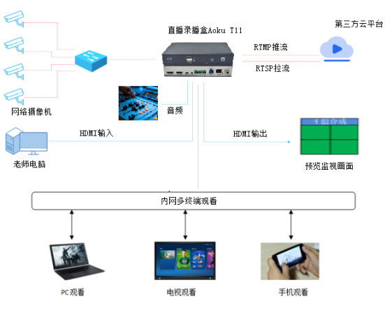 北極星通公司依托 15 年流媒體技術積累,推出Aoku T11 直播錄播盒: ✓ 極簡部署:單臺 T11 直播錄播盒接入校園網(wǎng)絡,即可實現(xiàn): 利舊現(xiàn)有網(wǎng)絡攝像機 / 調音臺等設備,支持 1080P 60fps 高清編碼,自動生成直播二維碼 / 鏈接,多終端同步觀看(支持 200 + 并發(fā)) ✓ 安全可控: 支持校園網(wǎng)內外網(wǎng)隔離部署 ✓ 智能歸檔: 自動生成標準格式視頻文件 支持按標簽分類存儲 提供 API 接口對接校園資源平臺 典型應用場景: ・專家講座:實時直播 + 在線互動 + 視頻存檔 ・精品課程:多機位錄制 + 智能剪輯 + 資源共享 ・大型活動:多會場聯(lián)動 + 在線投票 + 實時彈幕 ・應急指揮:多路監(jiān)控畫面融合直播